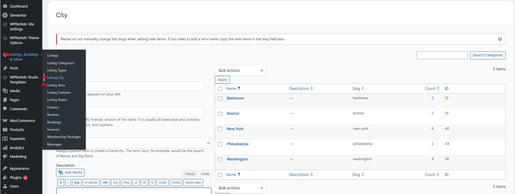 These are managed in WP Admin → Listings: