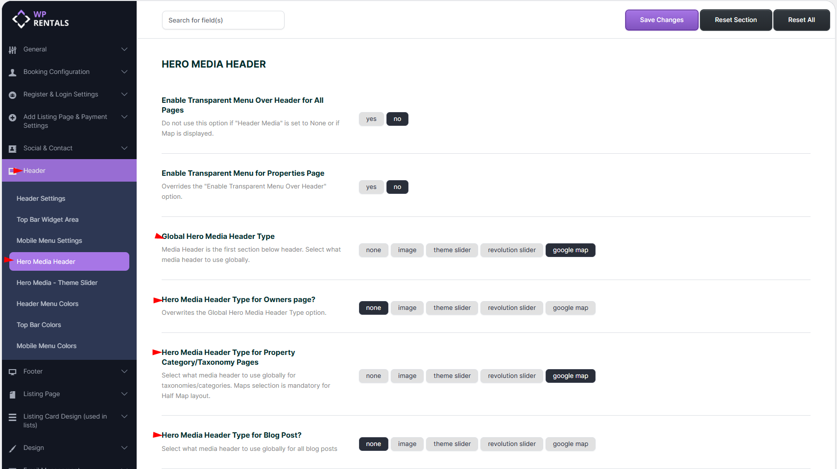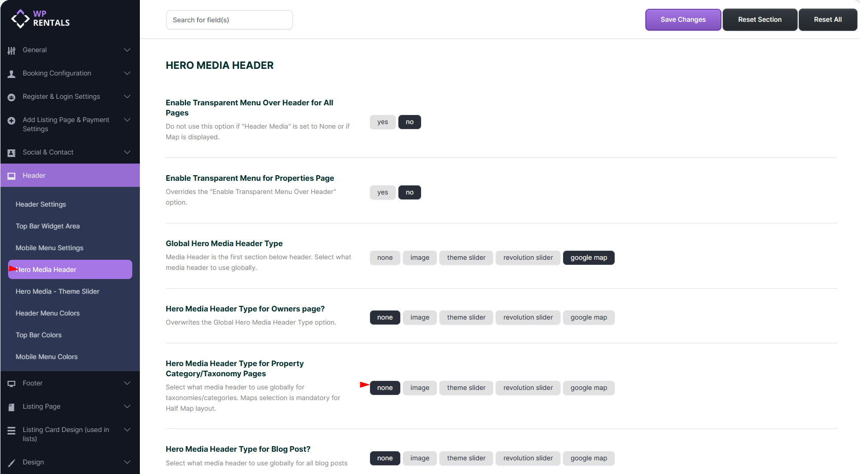 This guide explains how to control header appearance and map visibility in various parts of your website, including global pages, taxonomy/search results, single property pages, and the submit form. These instructions are particularly useful for users who want to customize the layout and appearance of their theme beyond the default settings.