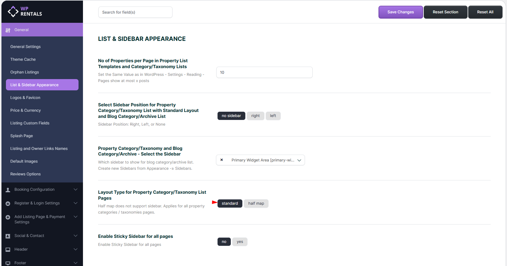 - Choose Standard layout Theme Options → General → List & Sidebar Appearance → Layout Type for Property Category/Taxonomy List Pages