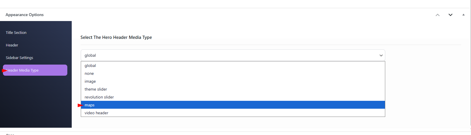 - If you wish to show the Map in the Contact Page – Choose Select Header Type as in the below Screenshot.