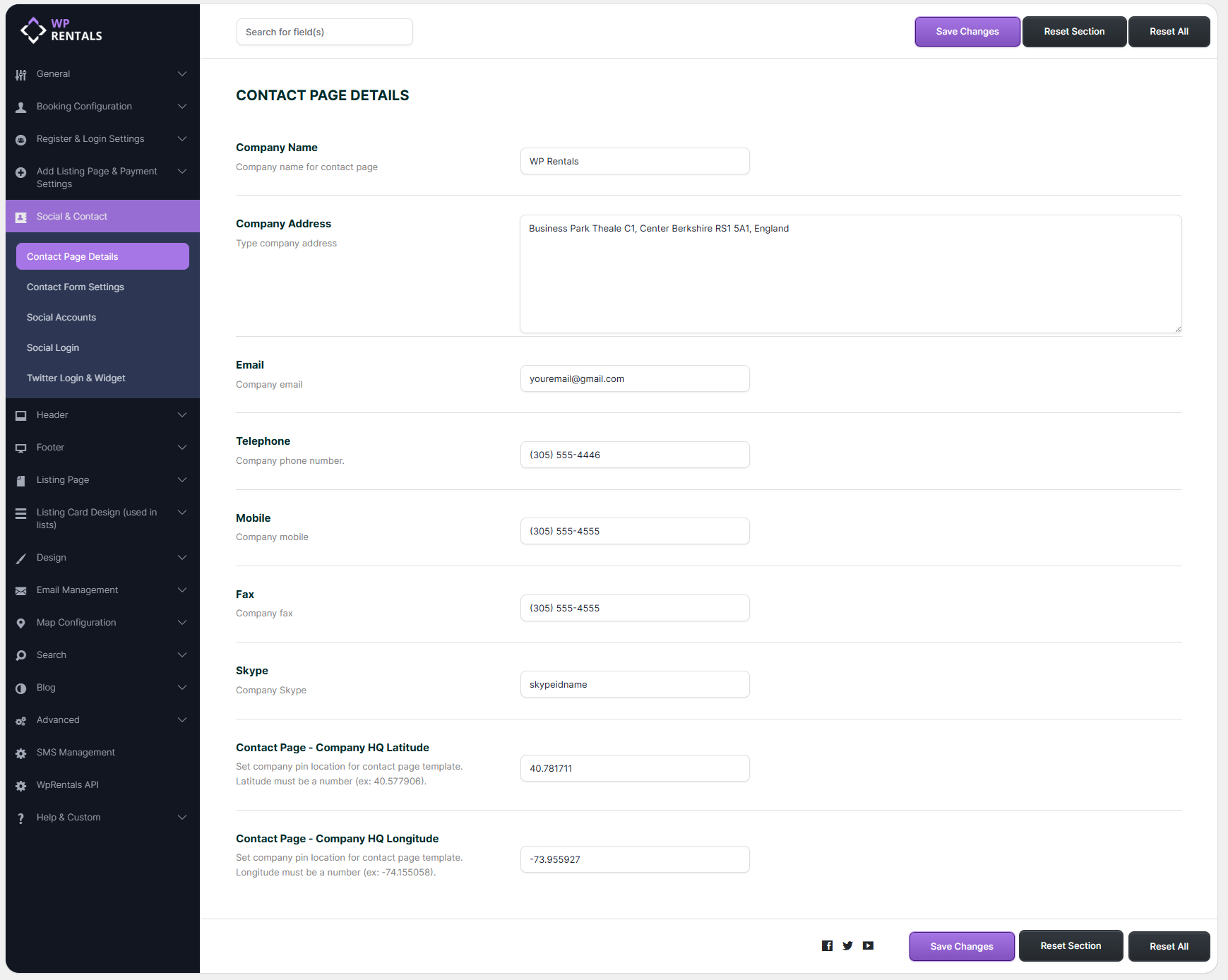 Contact Page Details section in WP Rentals allows you to configure the key contact information for your website, used especially on the Contact page template.