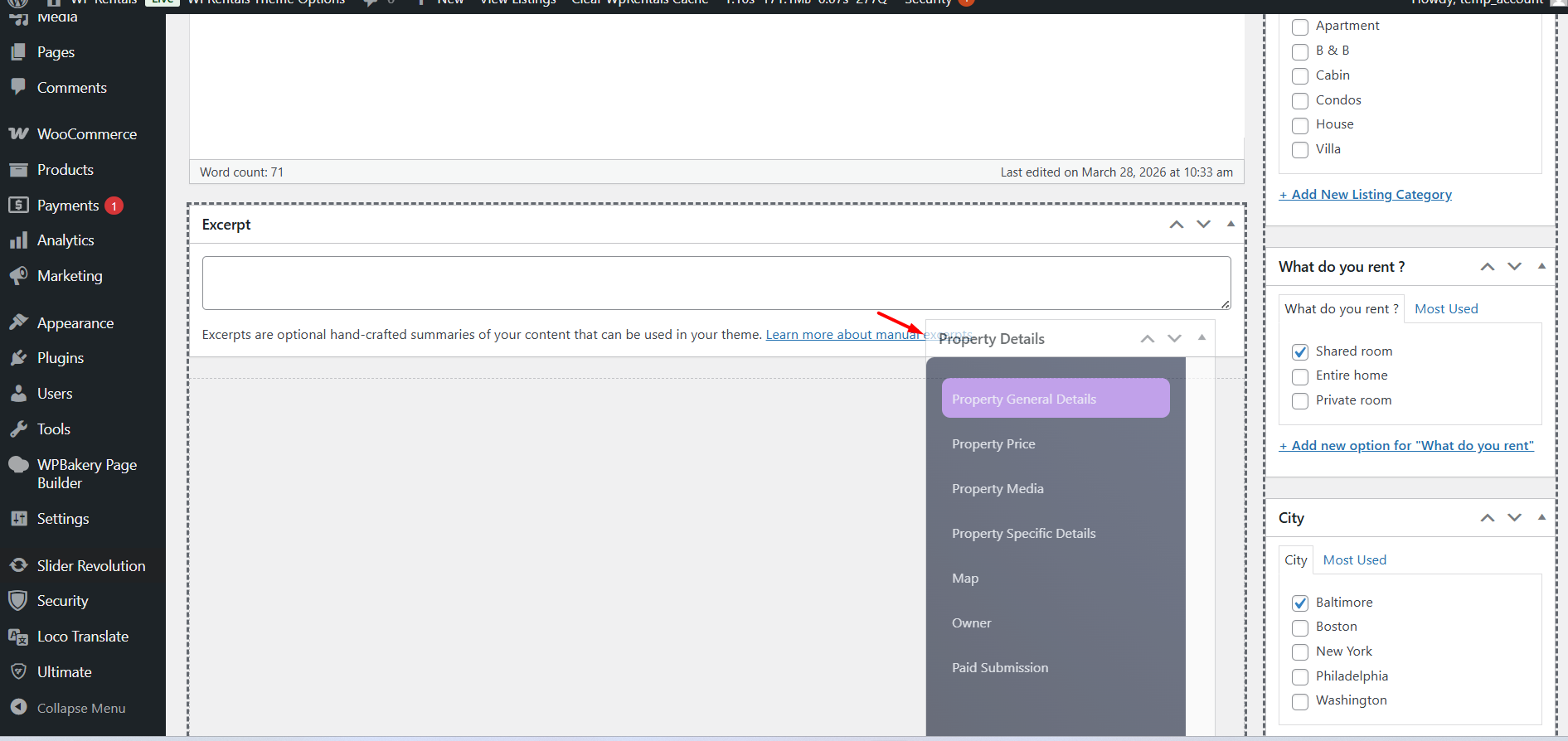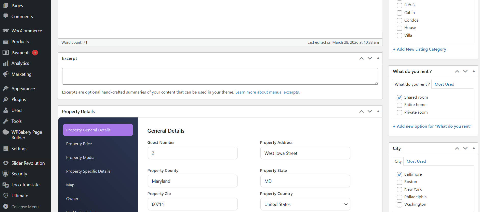 • Layout does not look like standard WordPress/WP Rentals editor.