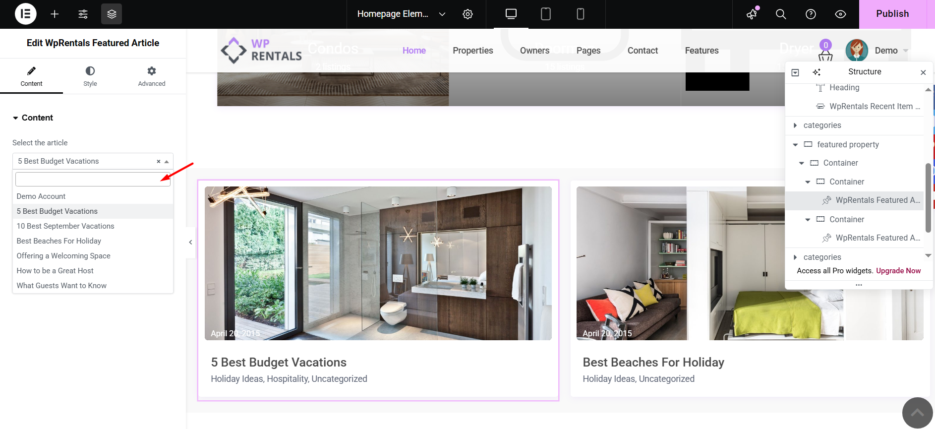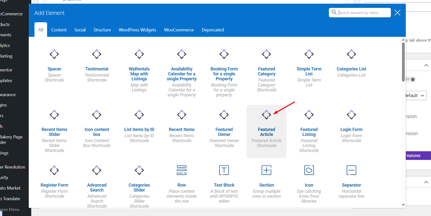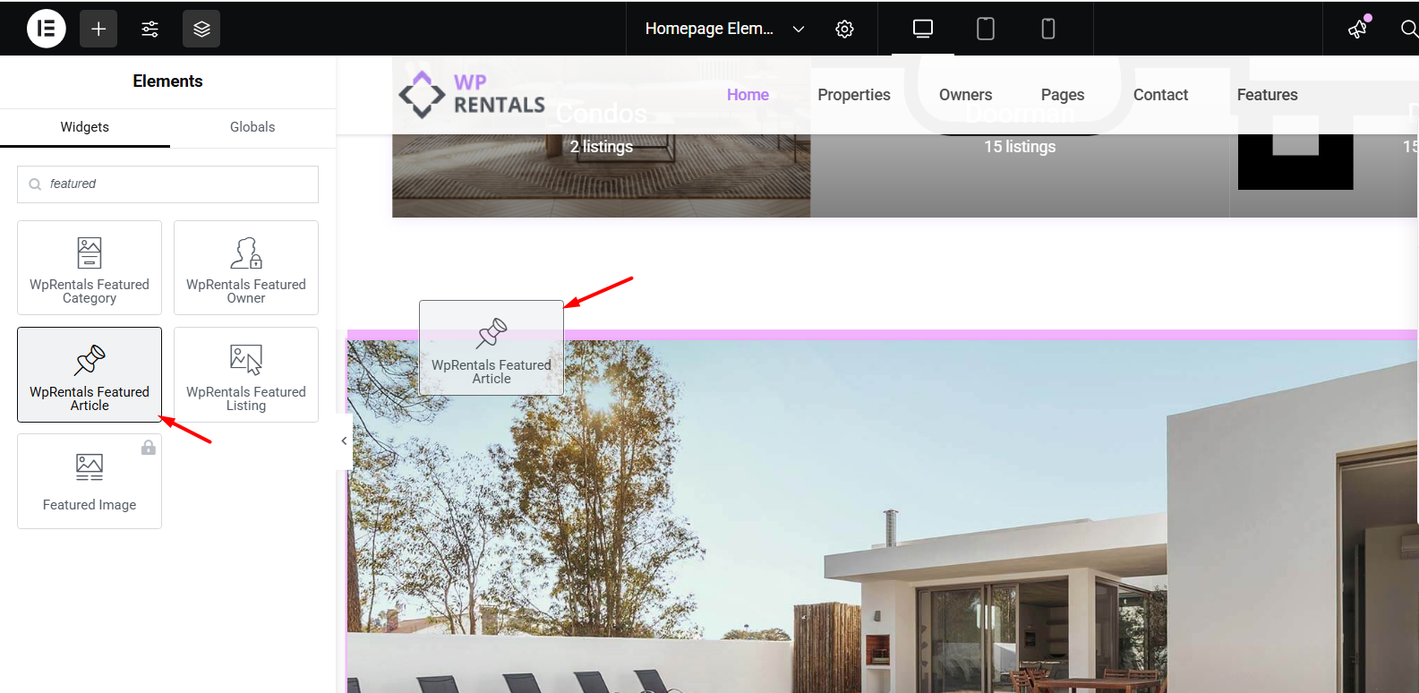 • In the Elementor sidebar, search for “WpRentals Featured Article”.
