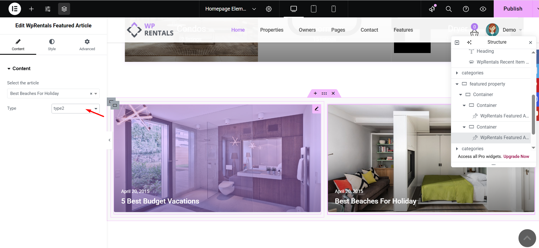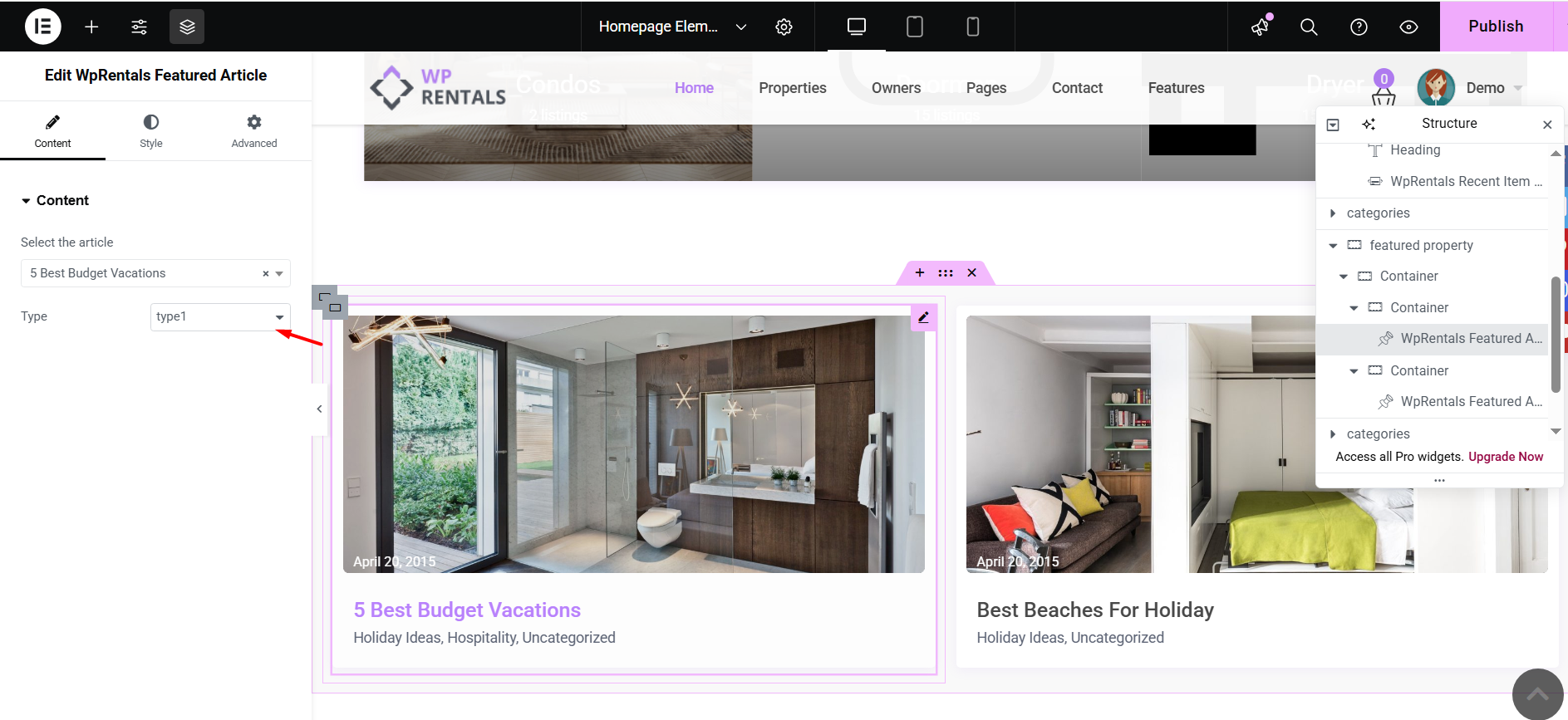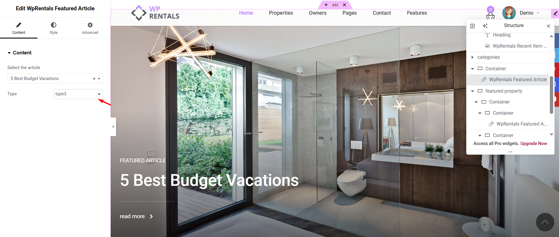• In the Elementor sidebar, search for “WpRentals Featured Article”.