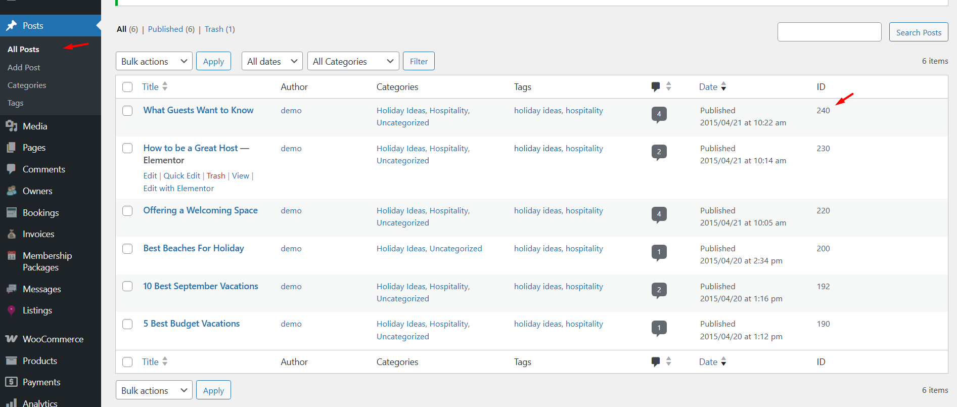 • Get the Listing ID from Wp-admin – > Listings -> ID column (copy the ID that corresponds to your listing)
