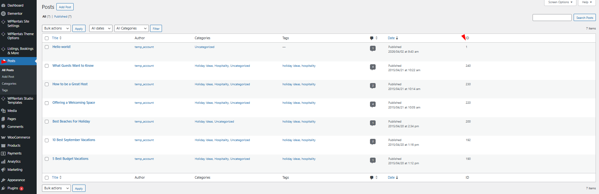 - Get the Listing ID from Wp-admin – >Posts-> ID column (copy the ID that corresponds to your listing)