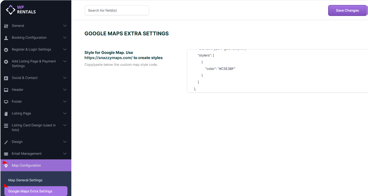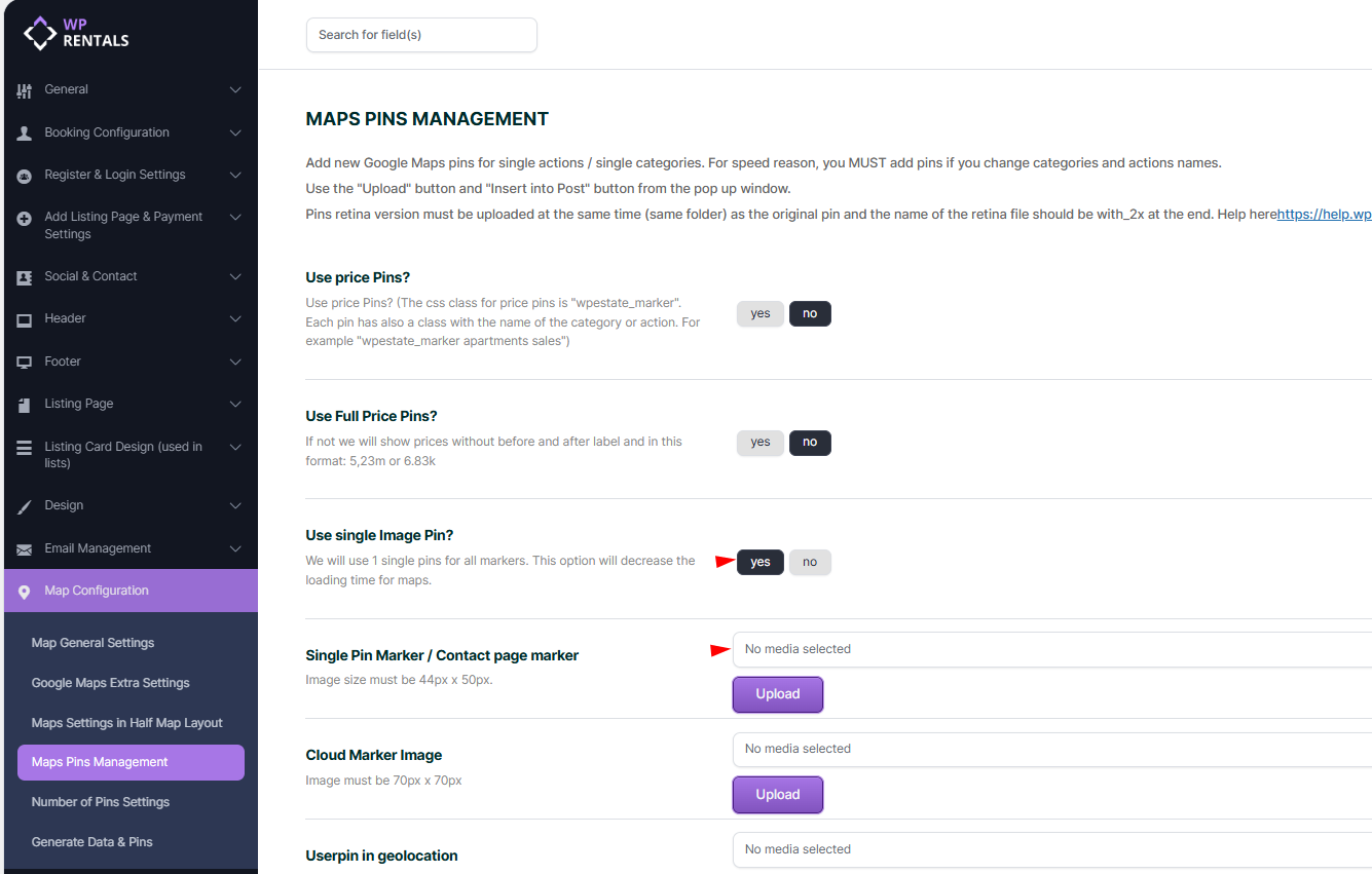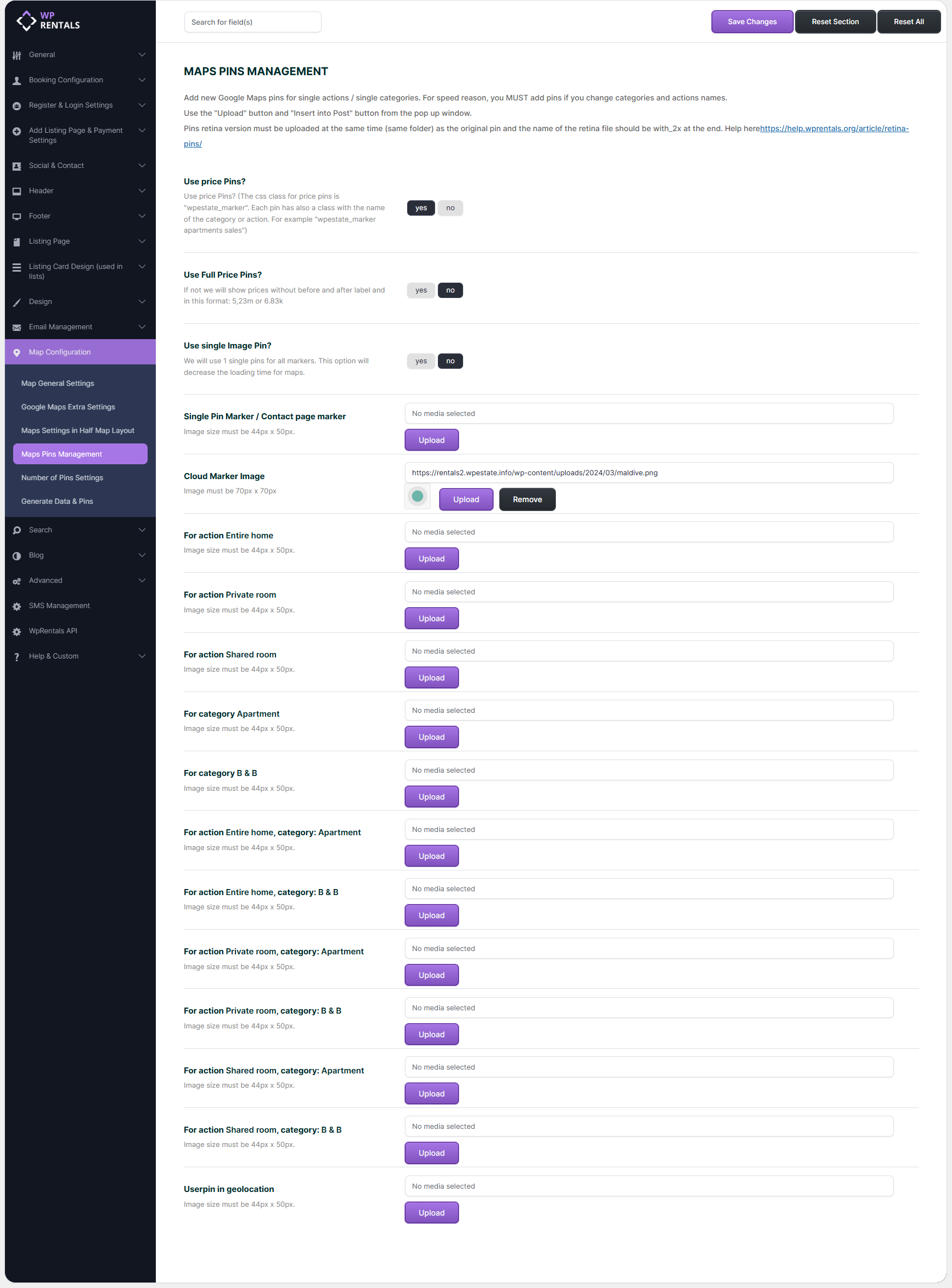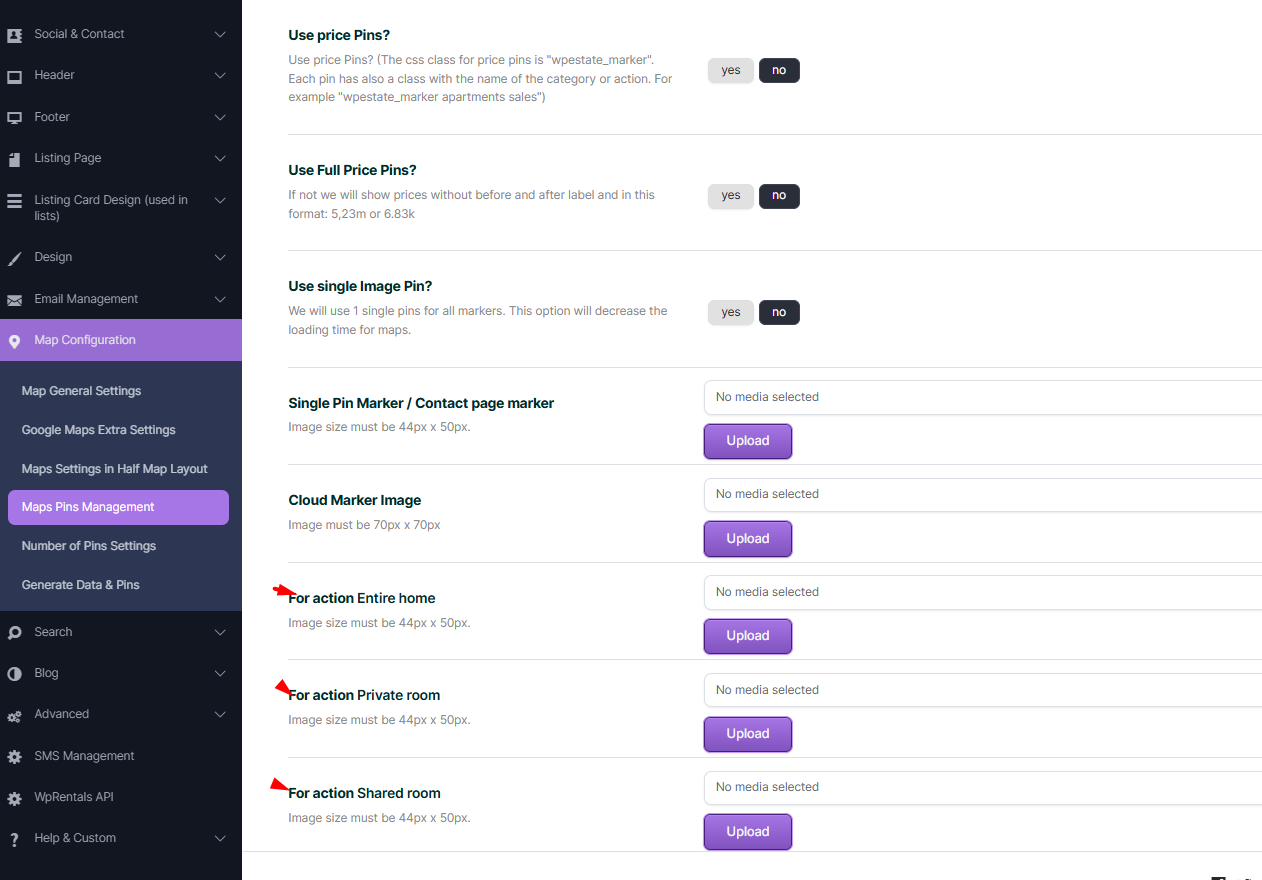 This section of WPRentals → Theme Options → Map Configuration → Maps Pins Management controls how map markers (pins) are displayed across all Google Maps used in the theme. Pins help users visually understand listing types, categories, prices, and actions directly on the map.
