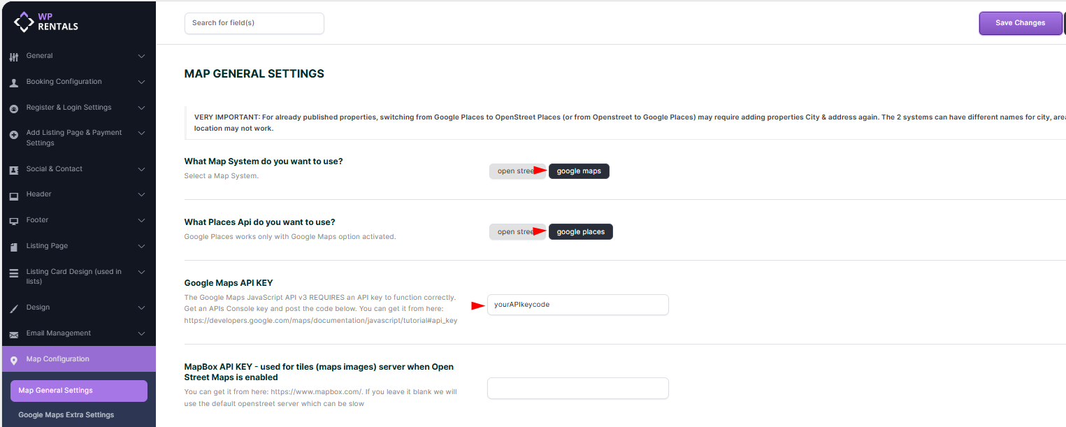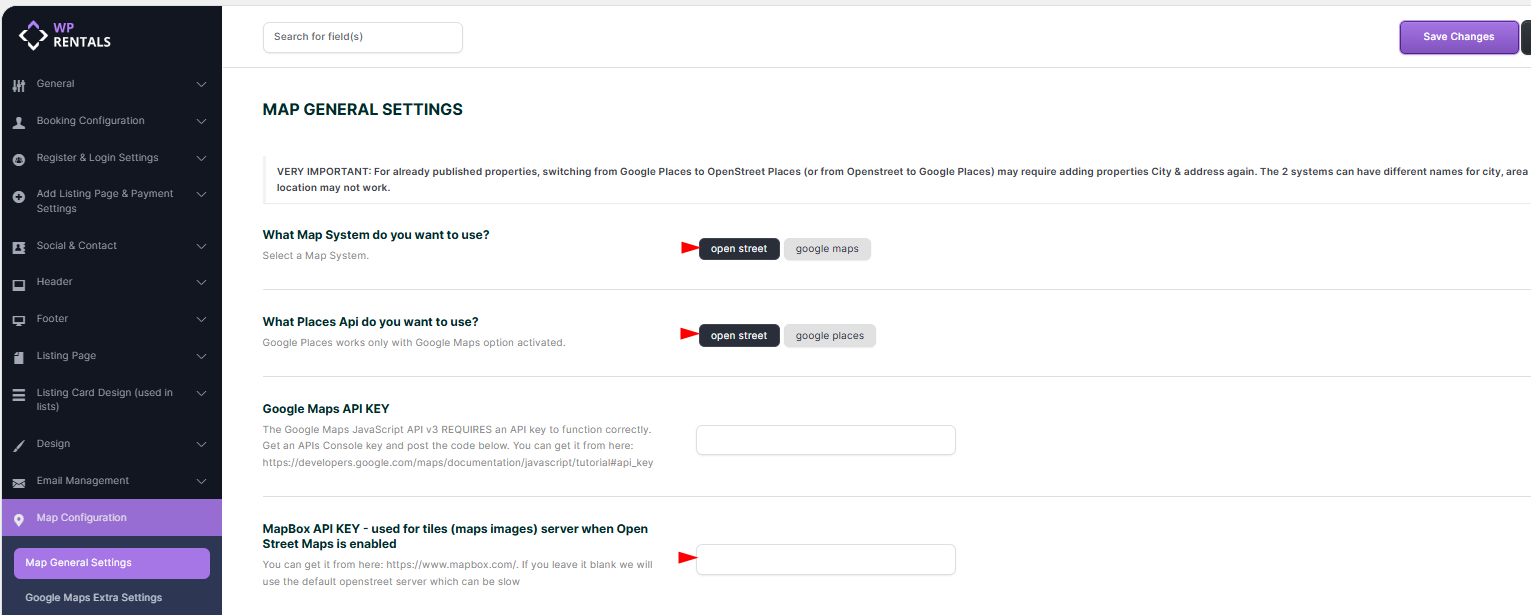 Choose the map system you want to use: Open Street Map or Google Maps.