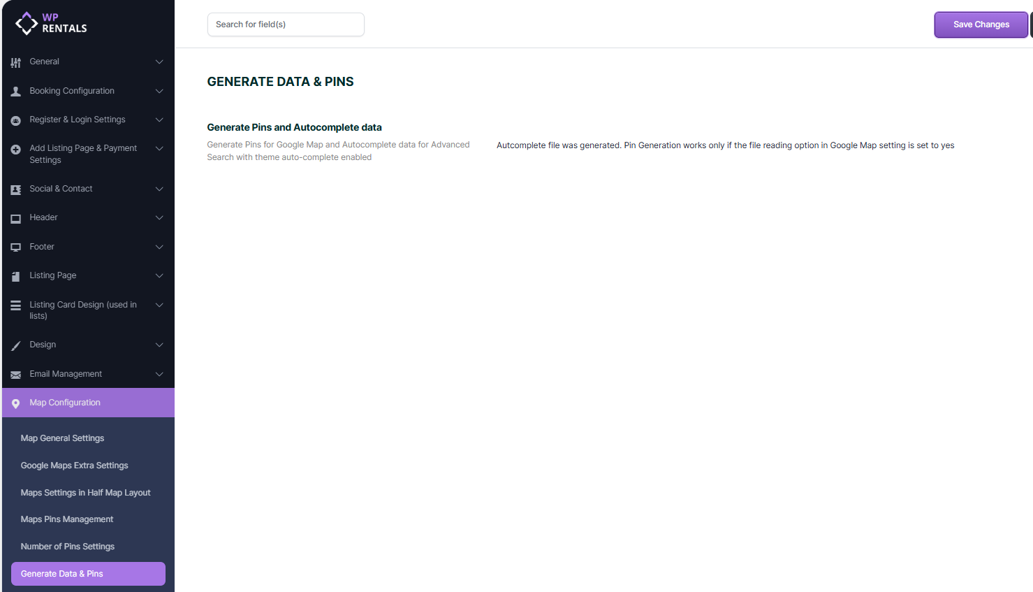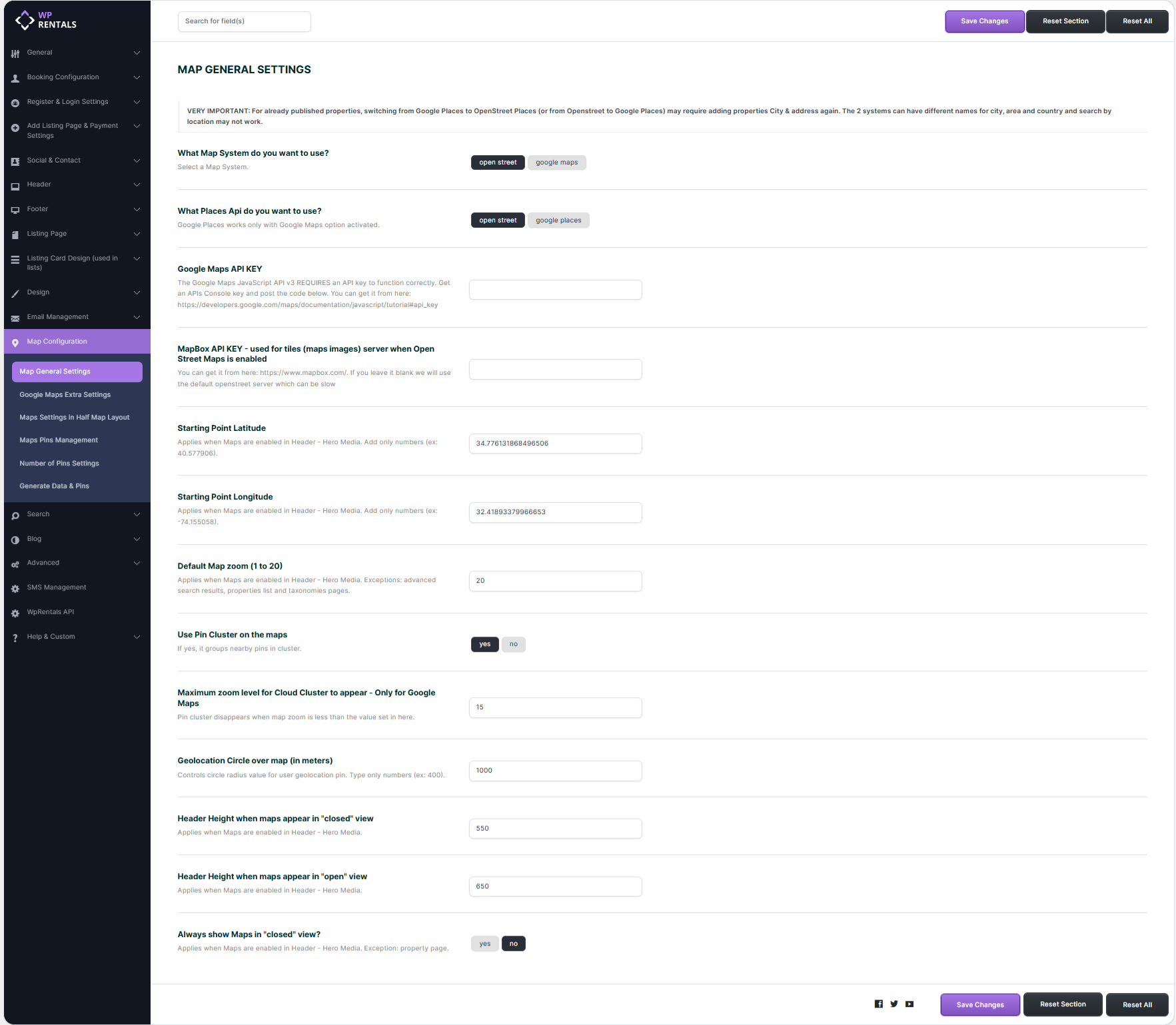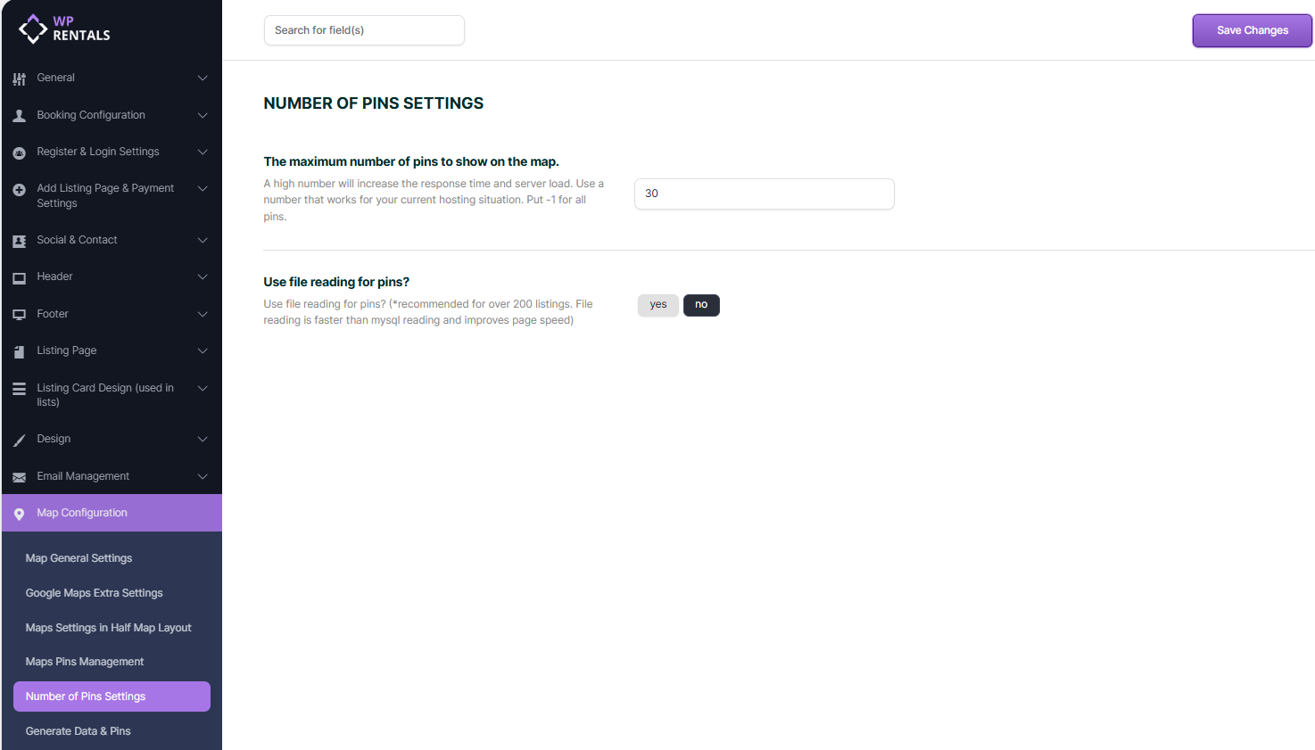 This section of WPRentals → Theme Options → Map Configuration → Number of Pins Settings controls how many listings are loaded and displayed on maps and how pin data is retrieved.