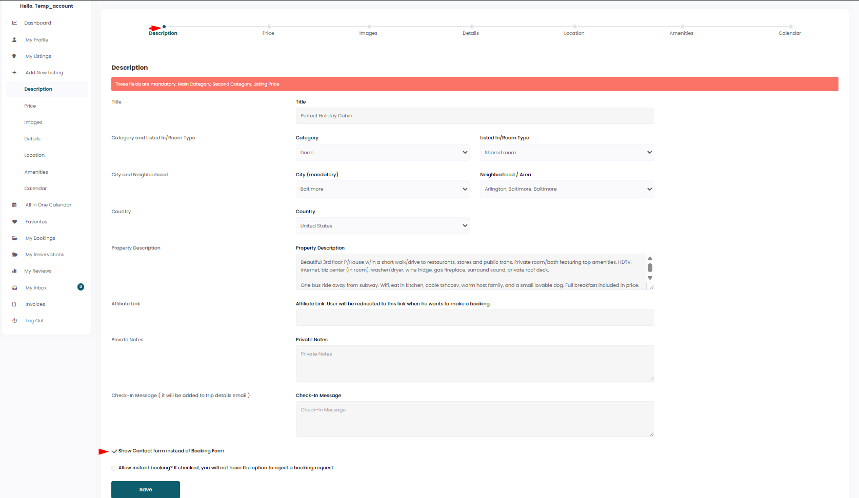 Once enabled, the contact form will replace the booking form on the listing page.