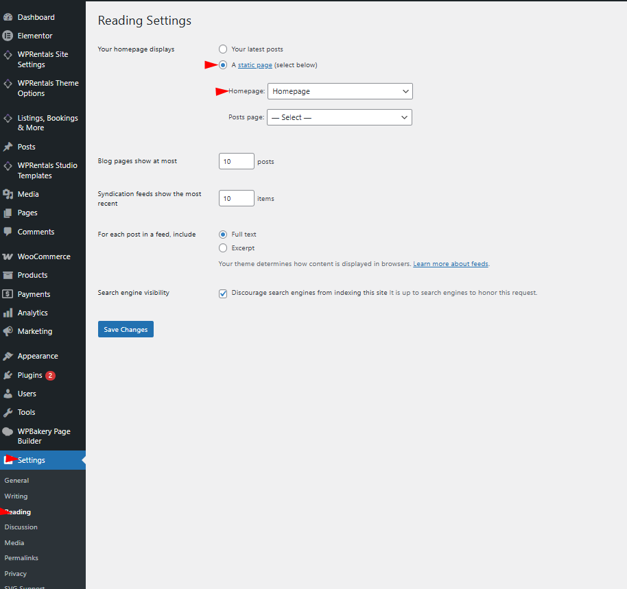 - After you create the new page, go to Settings -> Reading and check the static page option as “Homepage“.