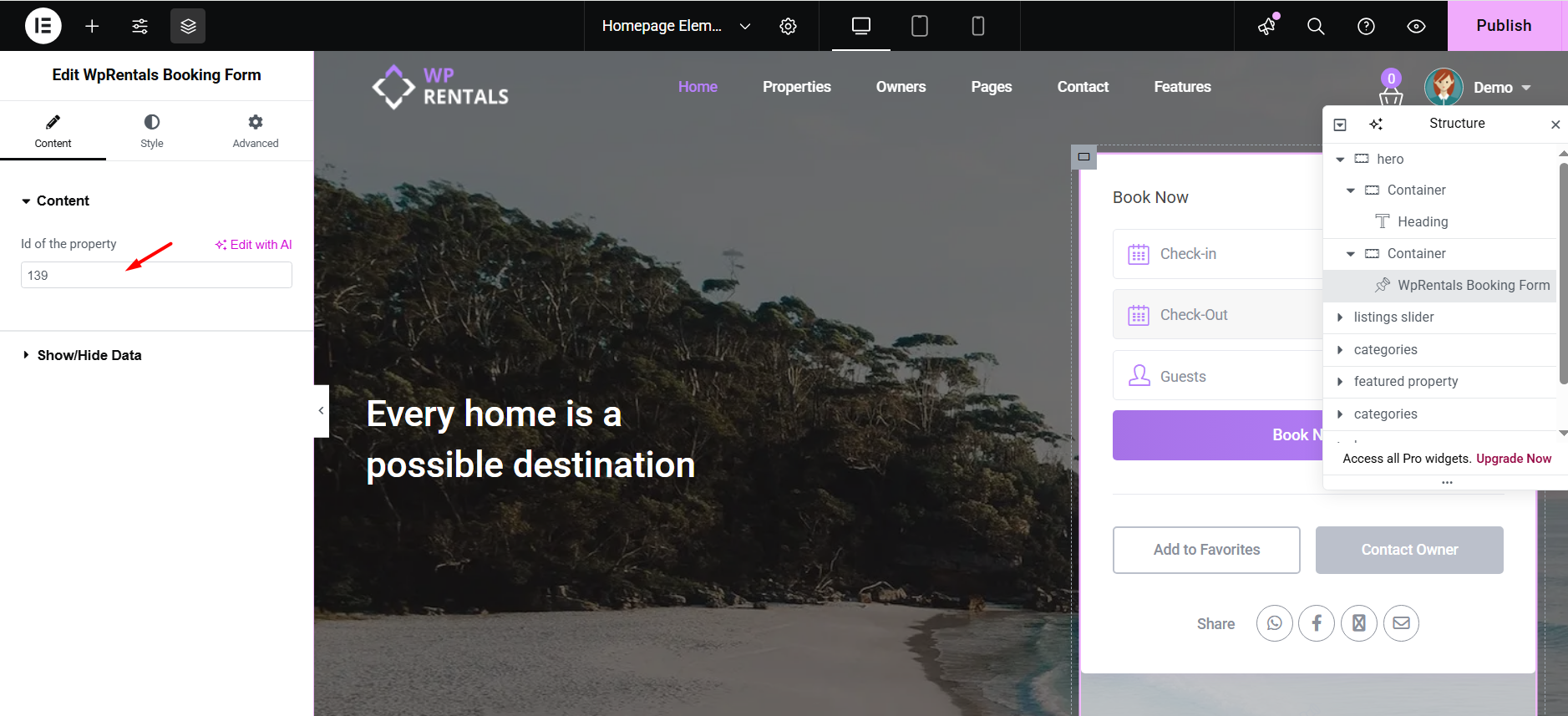 Select and add the property ID for which the booking form applies. Get the ID from the Listings list