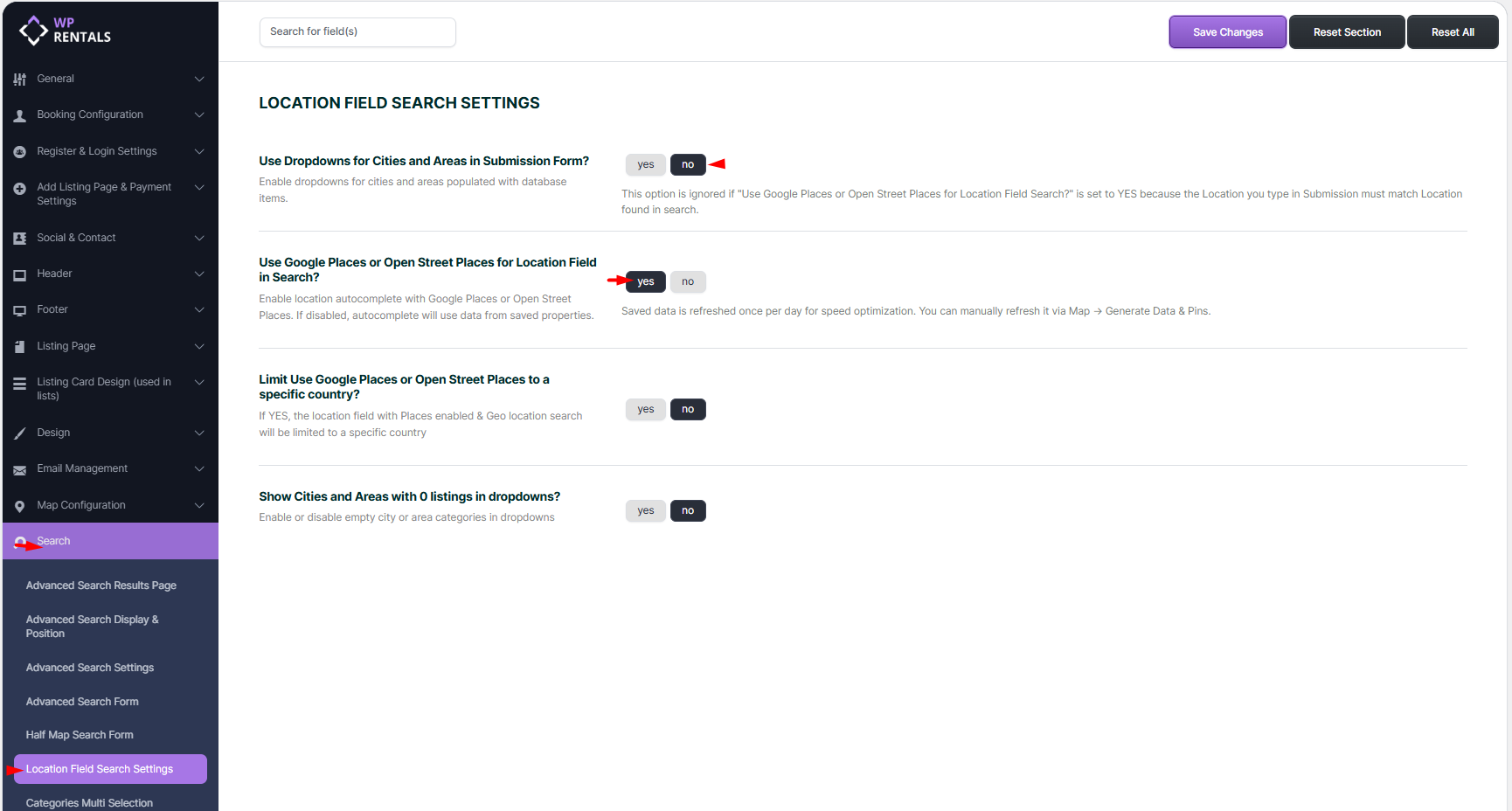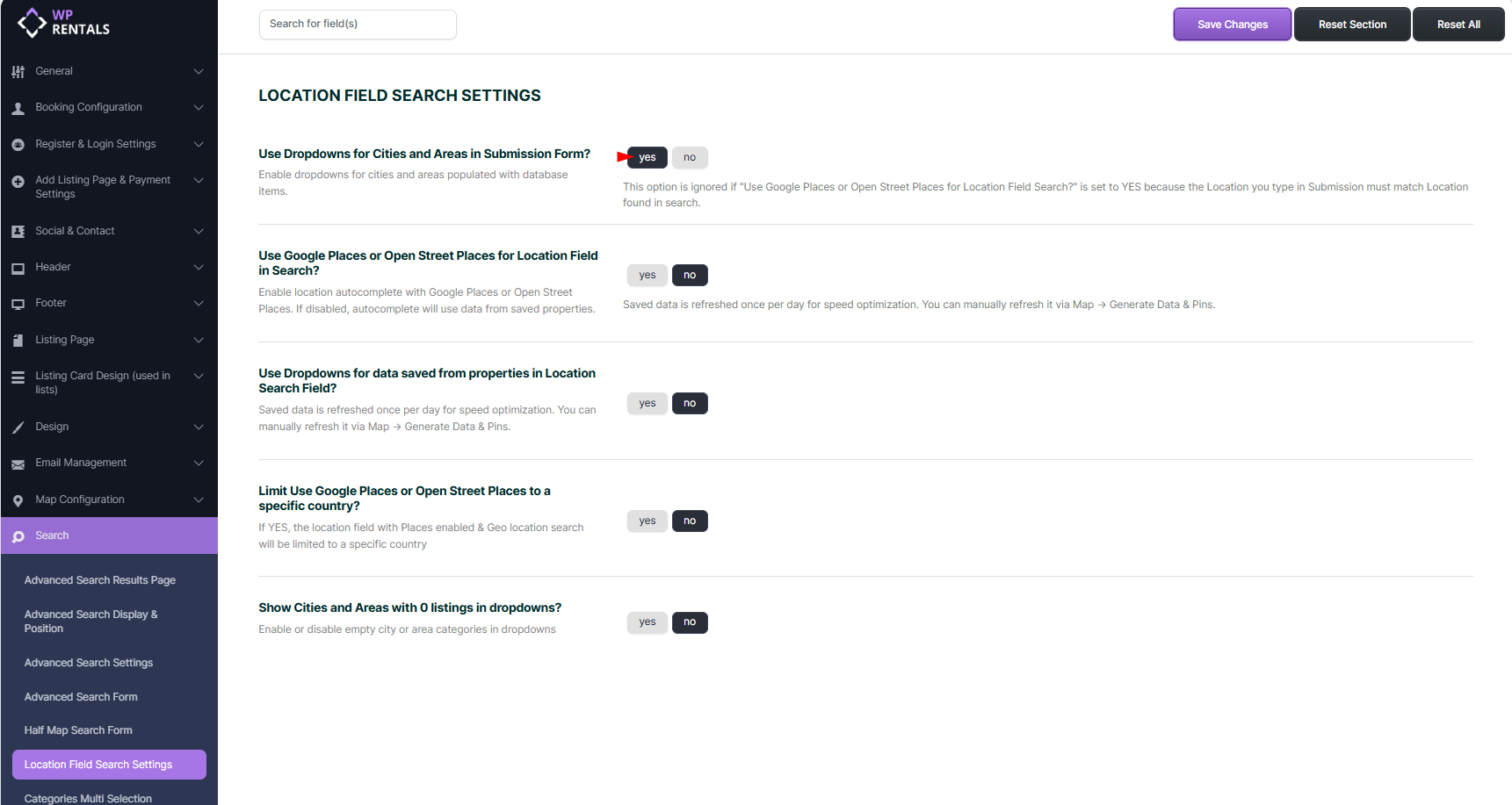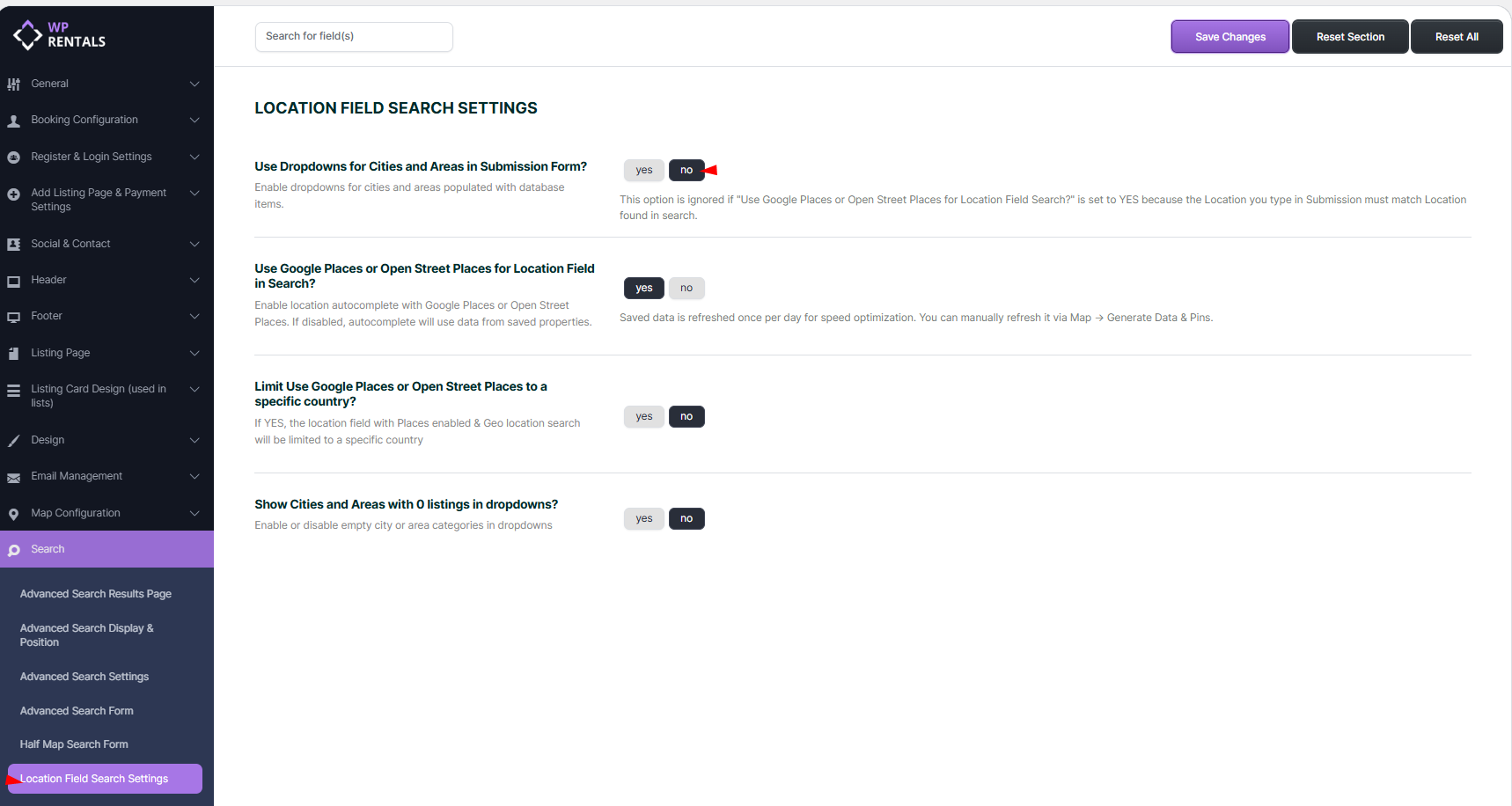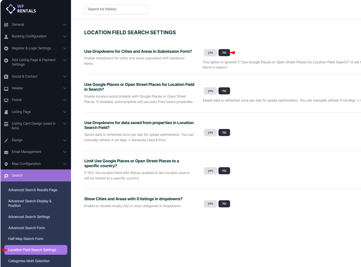 - Navigate to Admin > WpRentals Options > Search > Location Field Search Settings