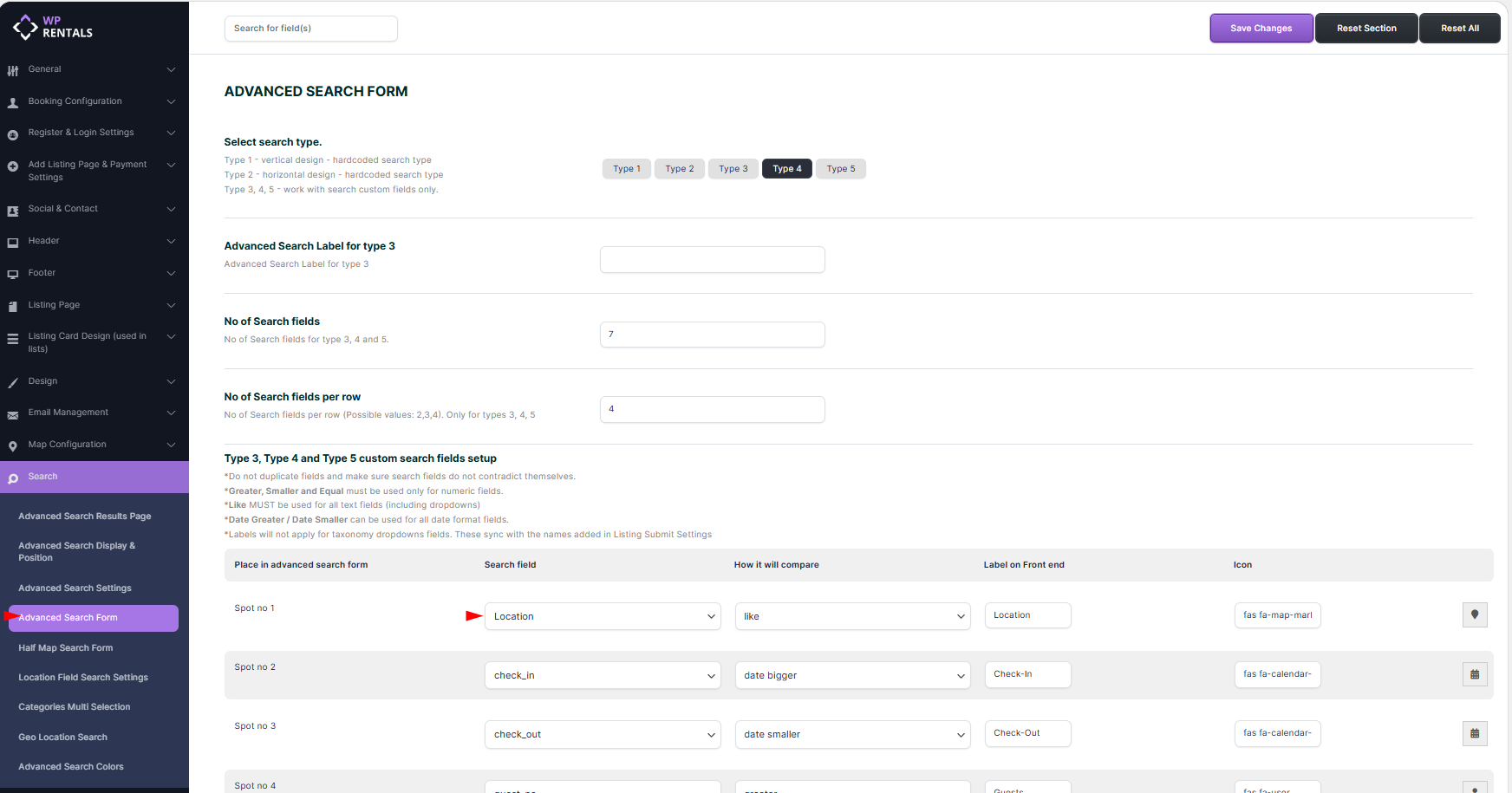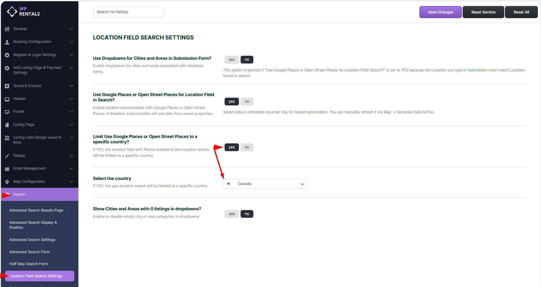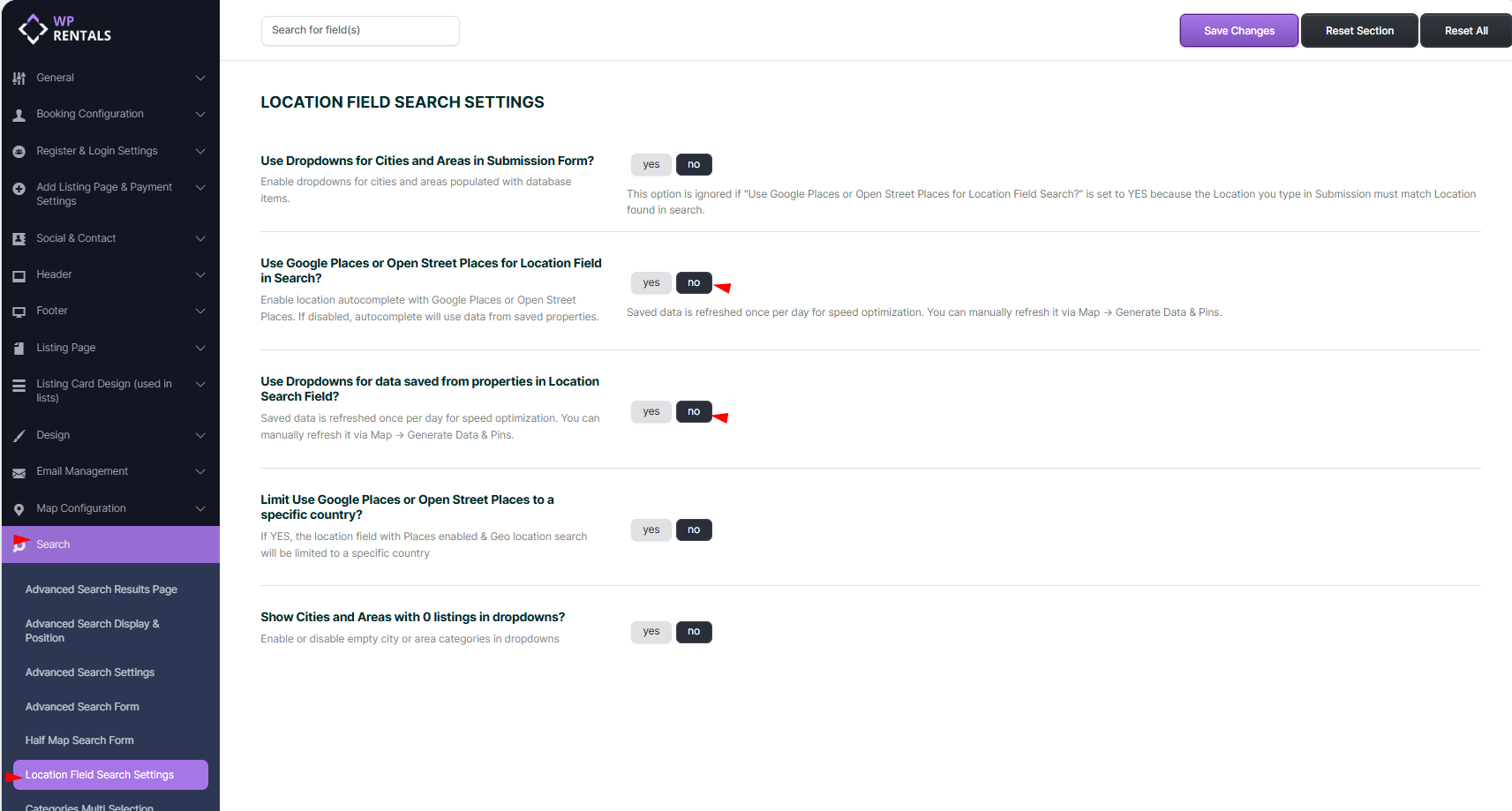 - Navigate to Admin > WpRentals Options > Search > Location Field Search Settings