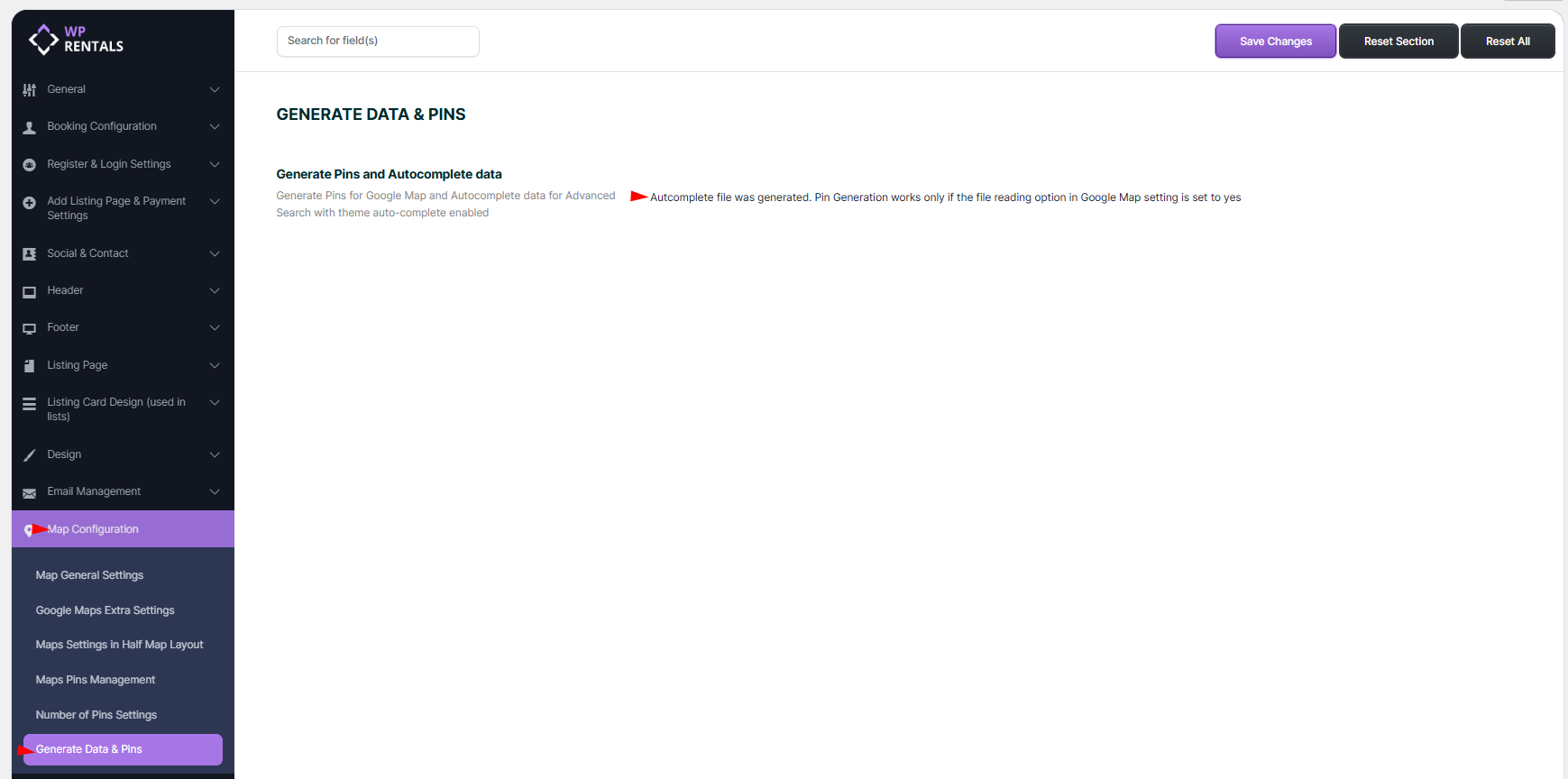 - To instantly display new property details in the autocomplete location in form, manually generate the data from Map Configuration > Generate Data & Pins