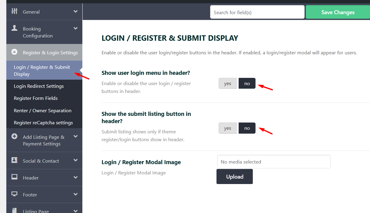 Submit Property button: Set “Show submit listing button in header?” to NO