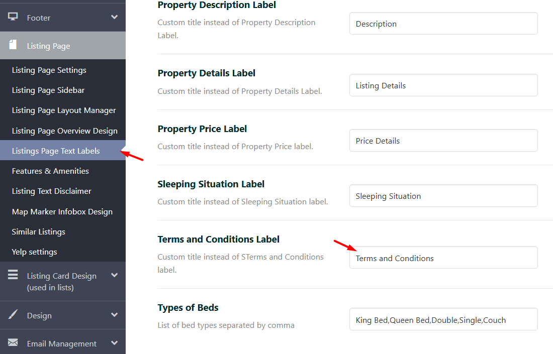 - Go to Theme Options → Listing Page → Listing Page Text Labels -> Terms and Conditions Label