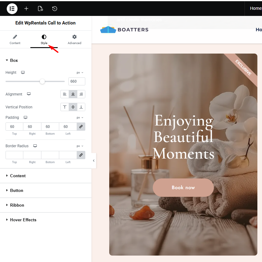 In the Content section, you can set box elements like text and button settings.