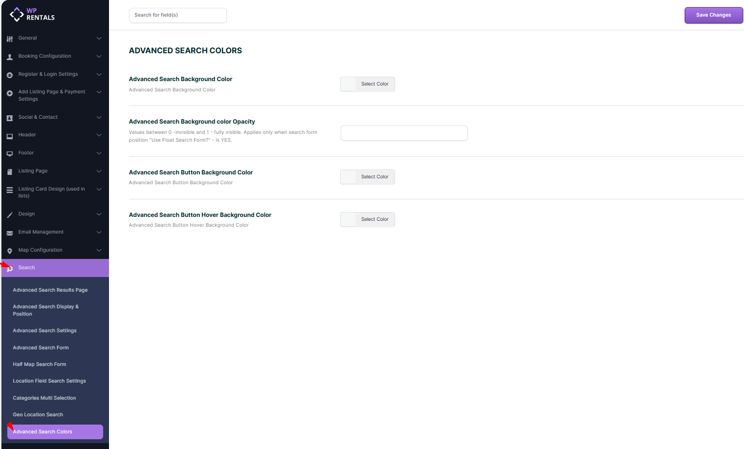 If your search form is created with the WpRentals Search Form Builder for Elementor, the button colors are not controlled from Theme Options → Advanced Search Colors.