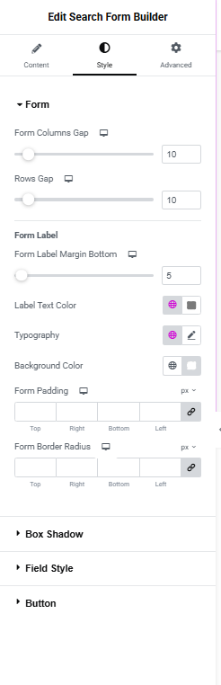 If you use the default theme search forms managed from Theme Options, you can set the button colors directly from the theme settings. If you use the Search Form Builder for Elementor, the button colors are managed inside the Elementor widget settings.