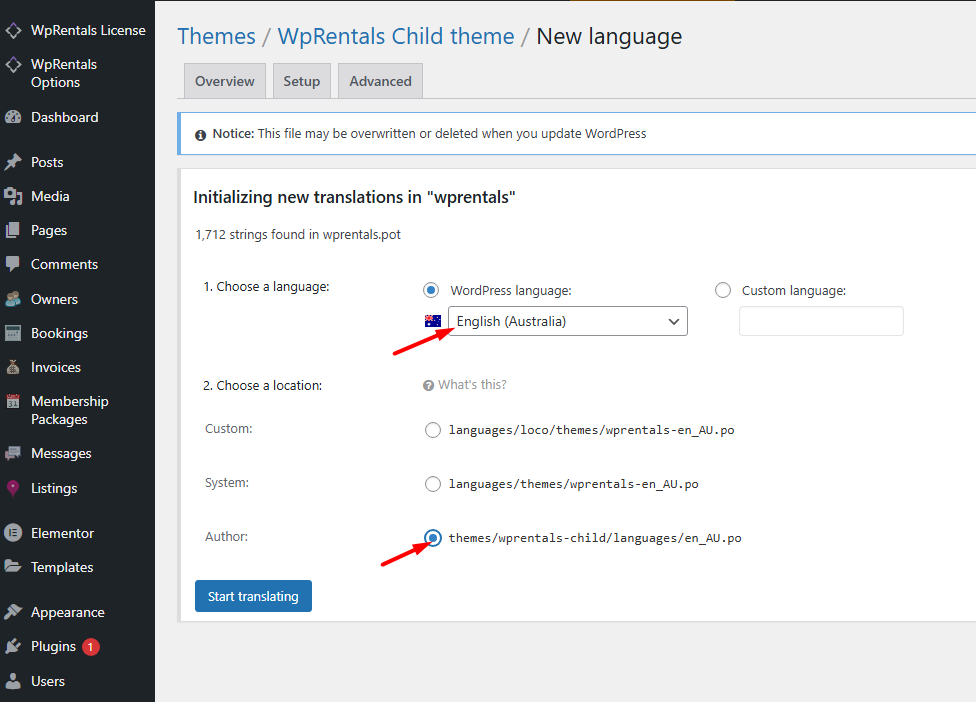 - Install the WpRentals Child theme first. Follow this help (so you don’t lose the theme custom translation when theme updates).