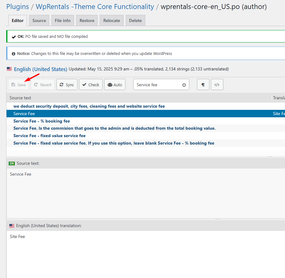- After the translation is done, you need to SAVE and rename both .po and .mo files with the proper name (for example de_DE.po). If the file name is not right the translation will not work. See this link for the proper name.