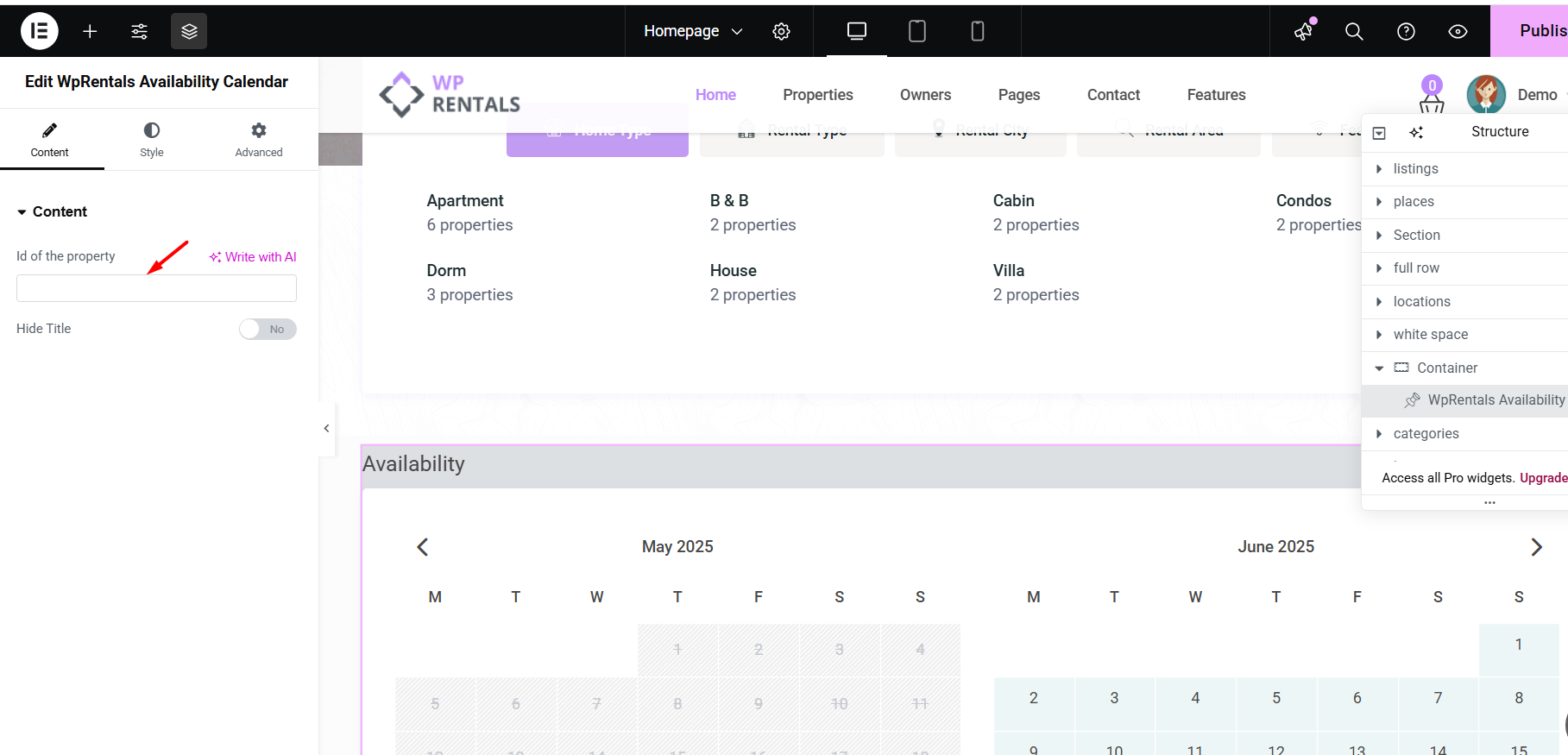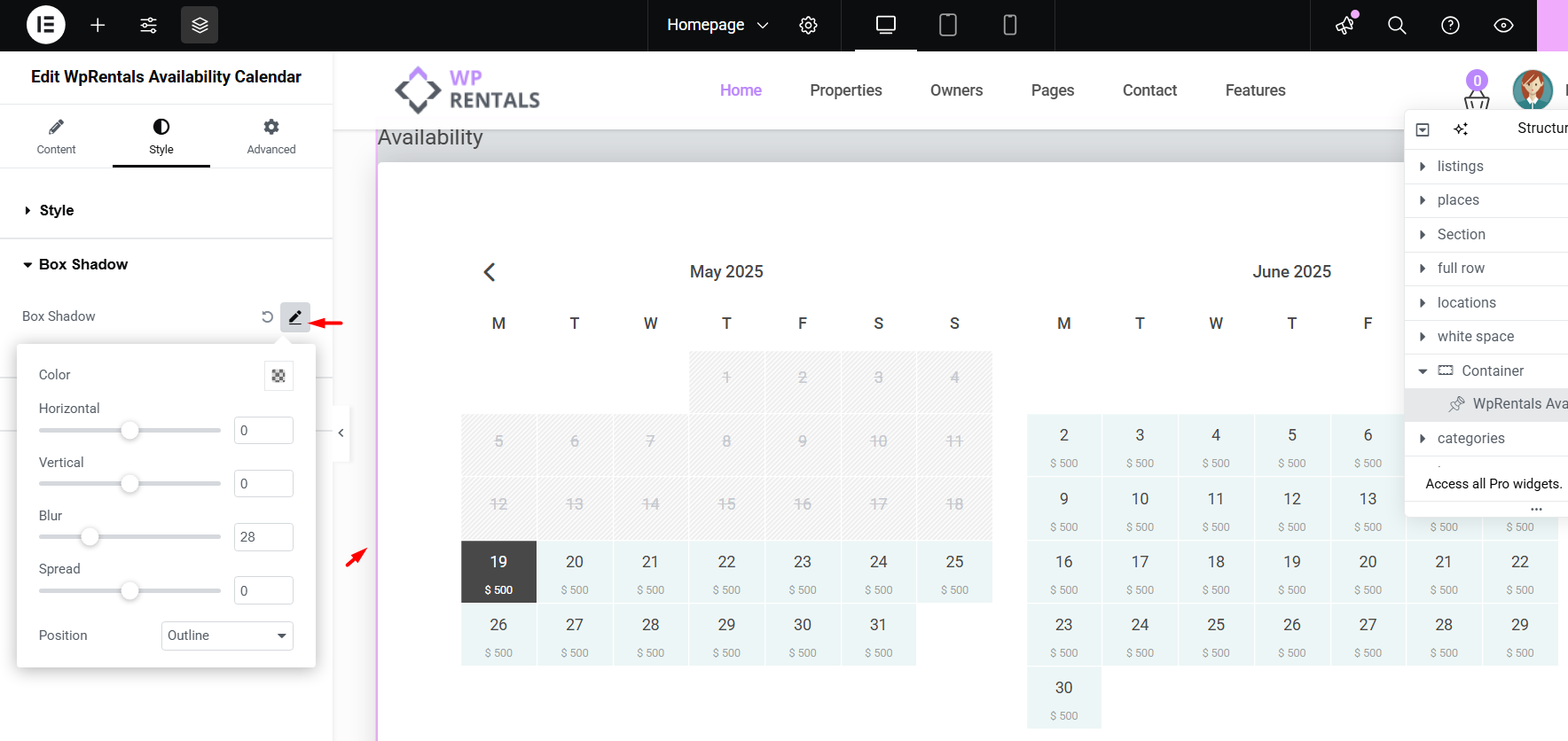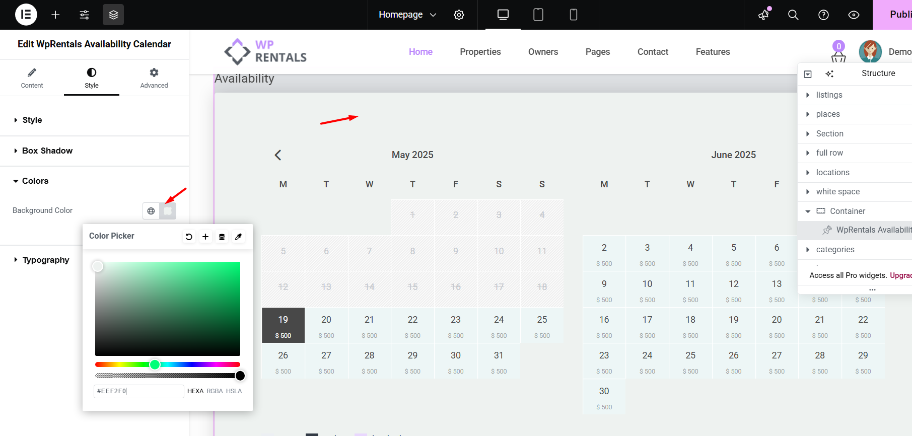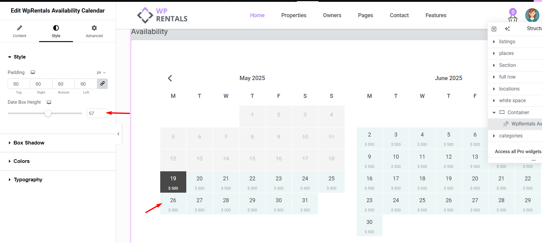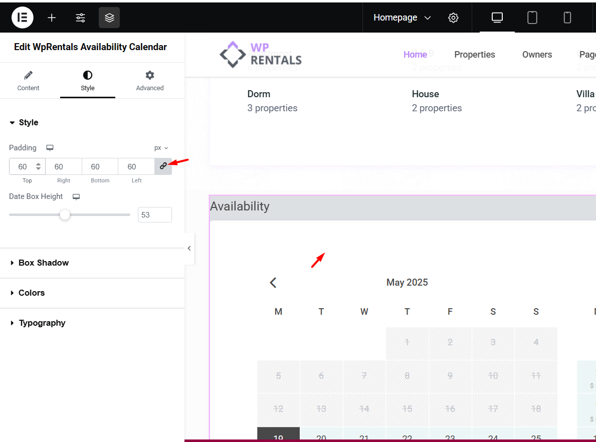 Other options in the WpRentals Availability Calendar in Elementor