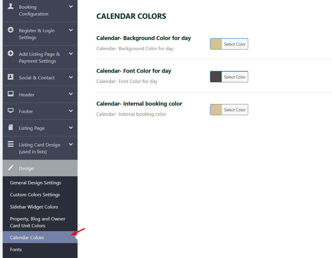 Calendar – Internal Booking Color: Defines the color used for dates that are internally booked.