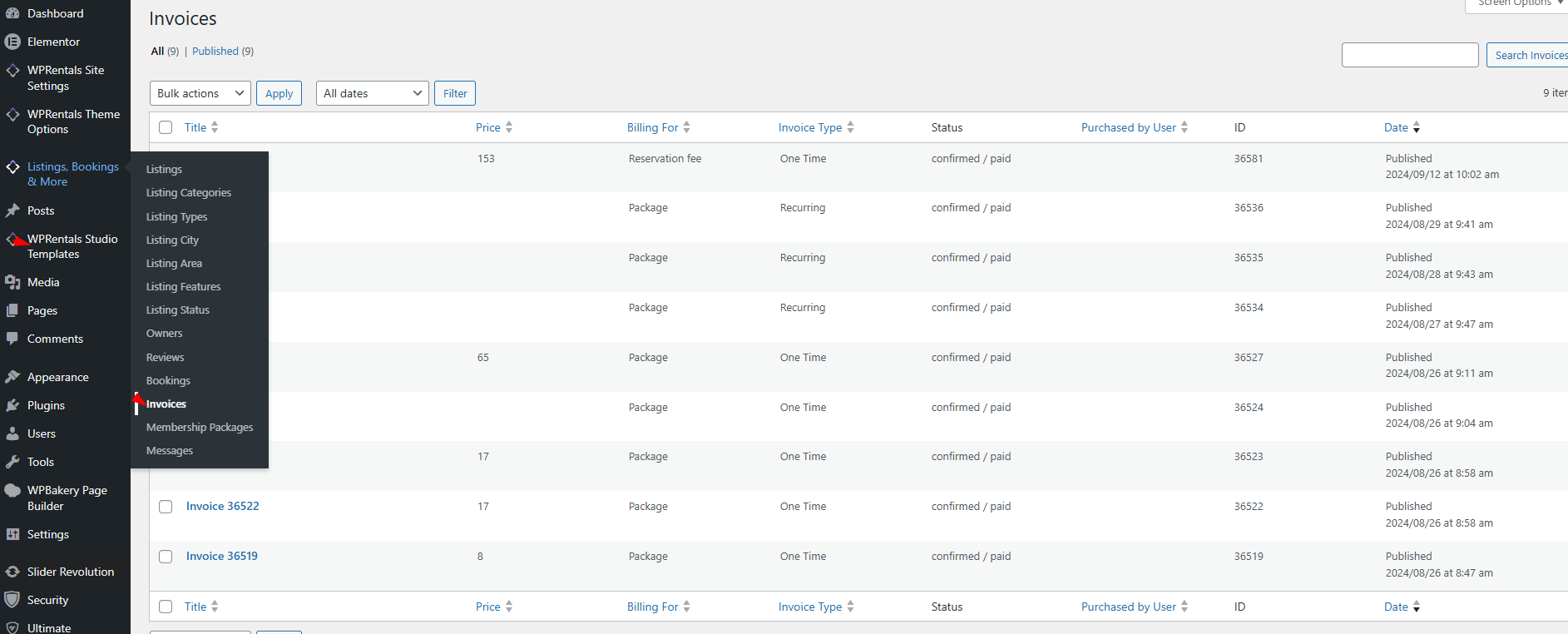 Depending on the website setup, invoice visibility may also include invoices related to listing submission payments, such as membership packages or paid submissions.