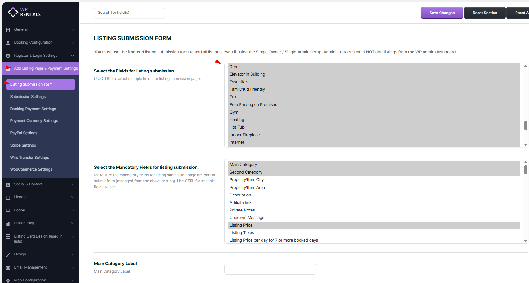 The features selected in theme options show in the “Add New Listing” form and in in Dashboard -> My Listings -> Edit Listing -> Amenities Section