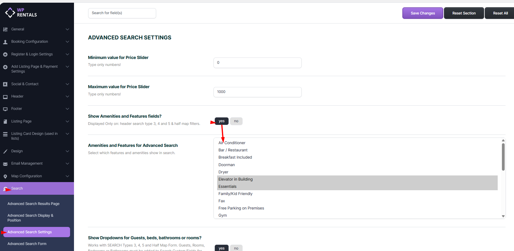 You can select which features and amenities to display in the search from the admin panel under Theme Options → Search → Advanced Search Settings -> Show Amenities and Features Fields > Select the Amenities and Features for Advanced Search