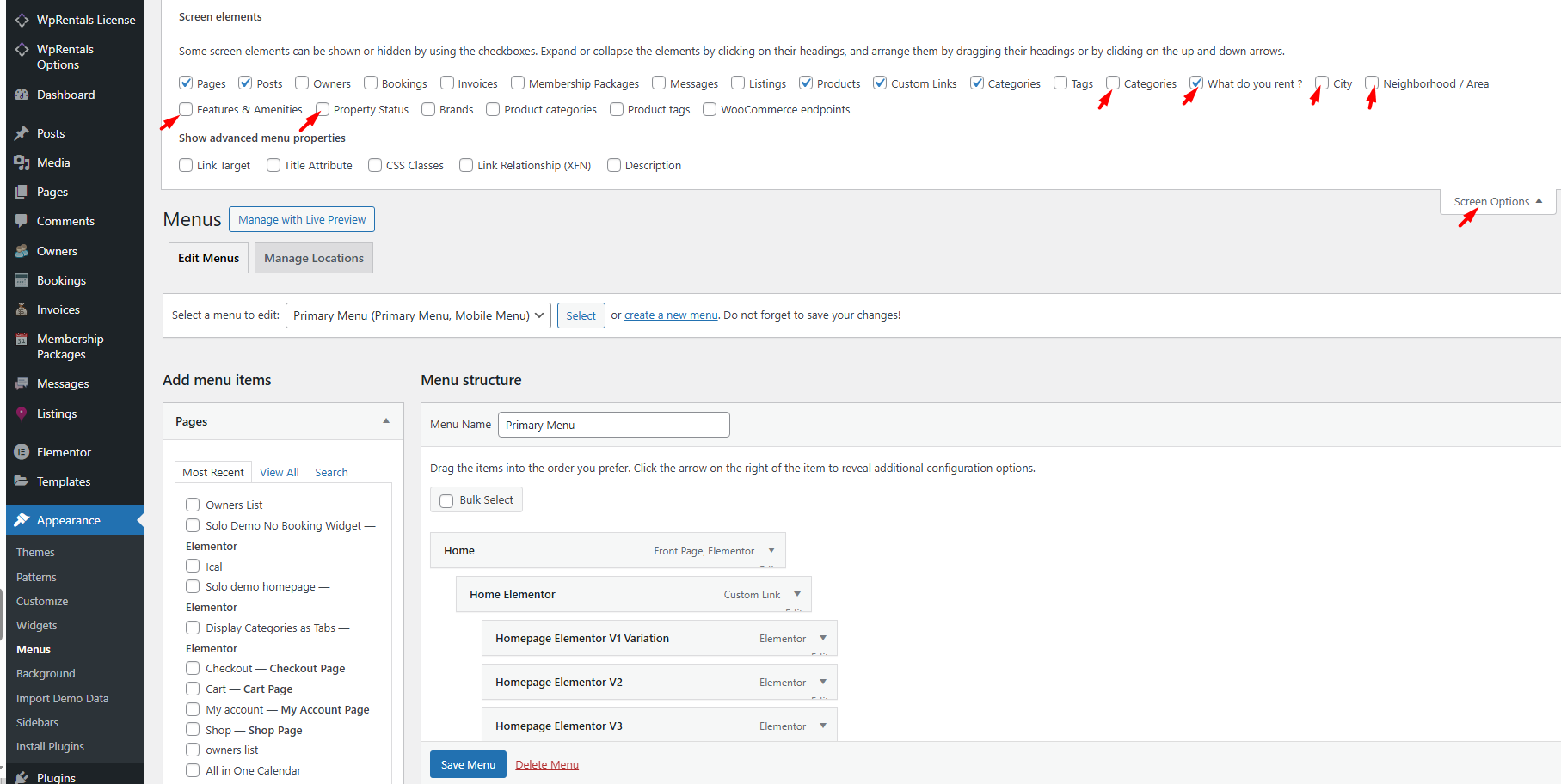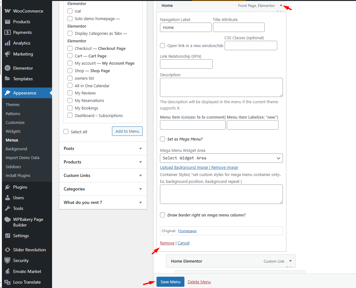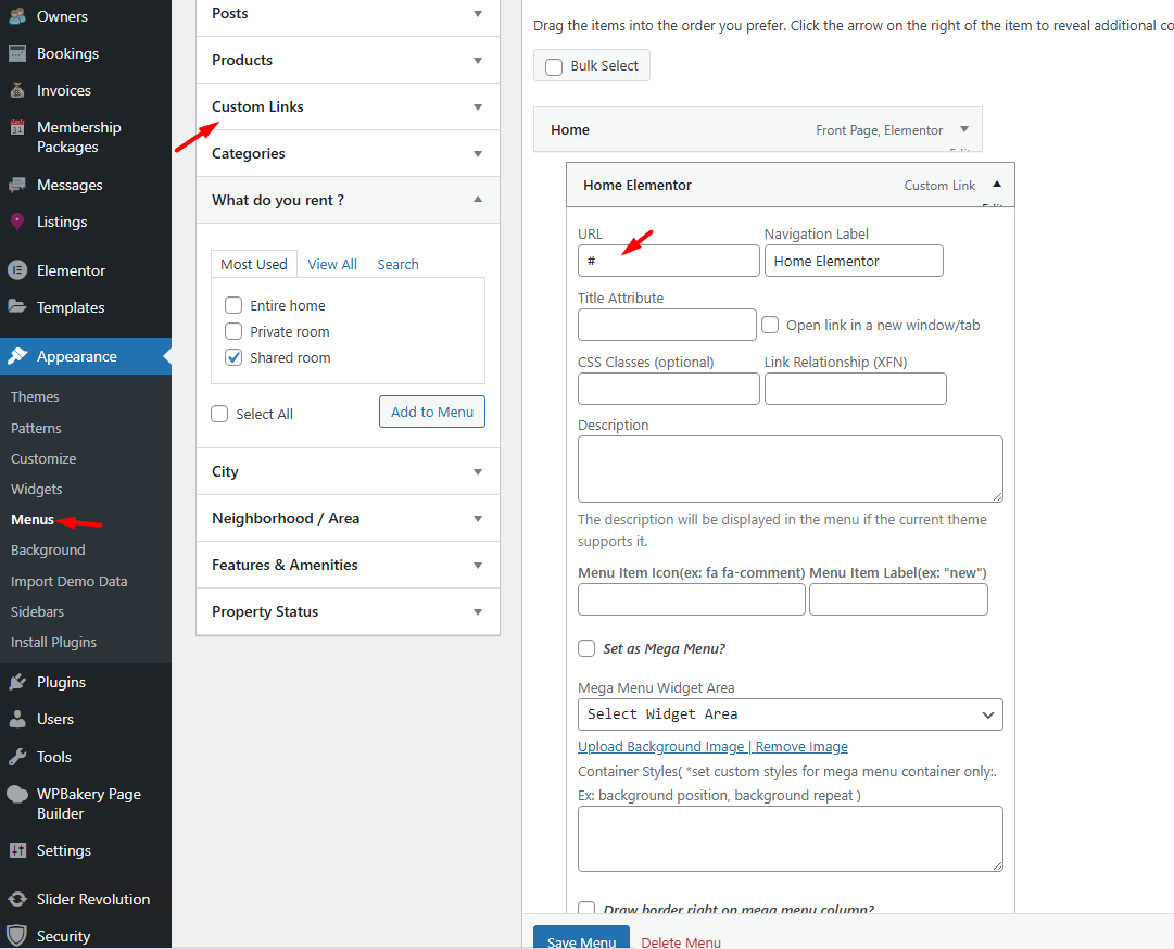 In the WpRentals custom menu fields (visible only when WpRentals is active), check the box: “Set as Mega Menu”