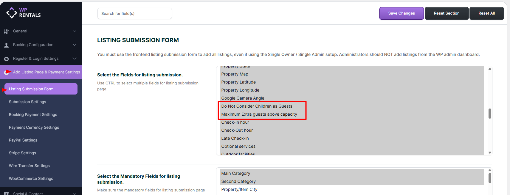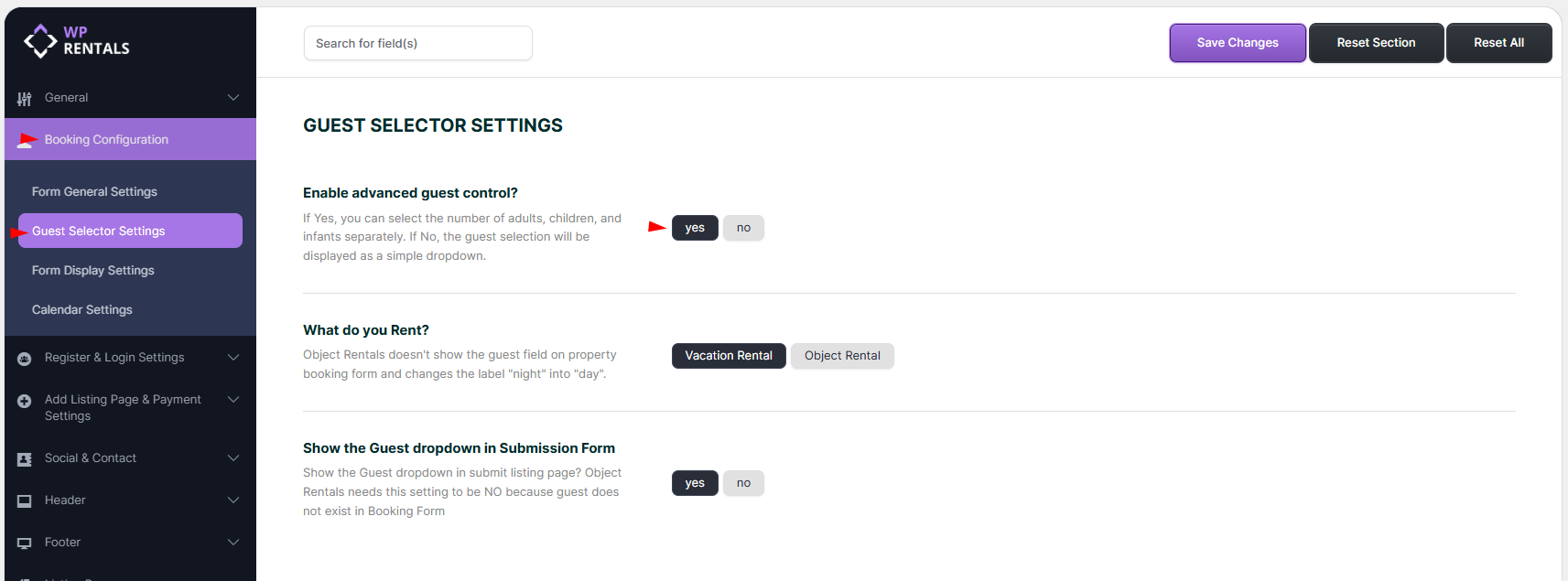 If set to “Yes” make sure the Extra price per guest fields, Do not consider Children as Guests, Maximum Extra guests above capacity are included in the submission form