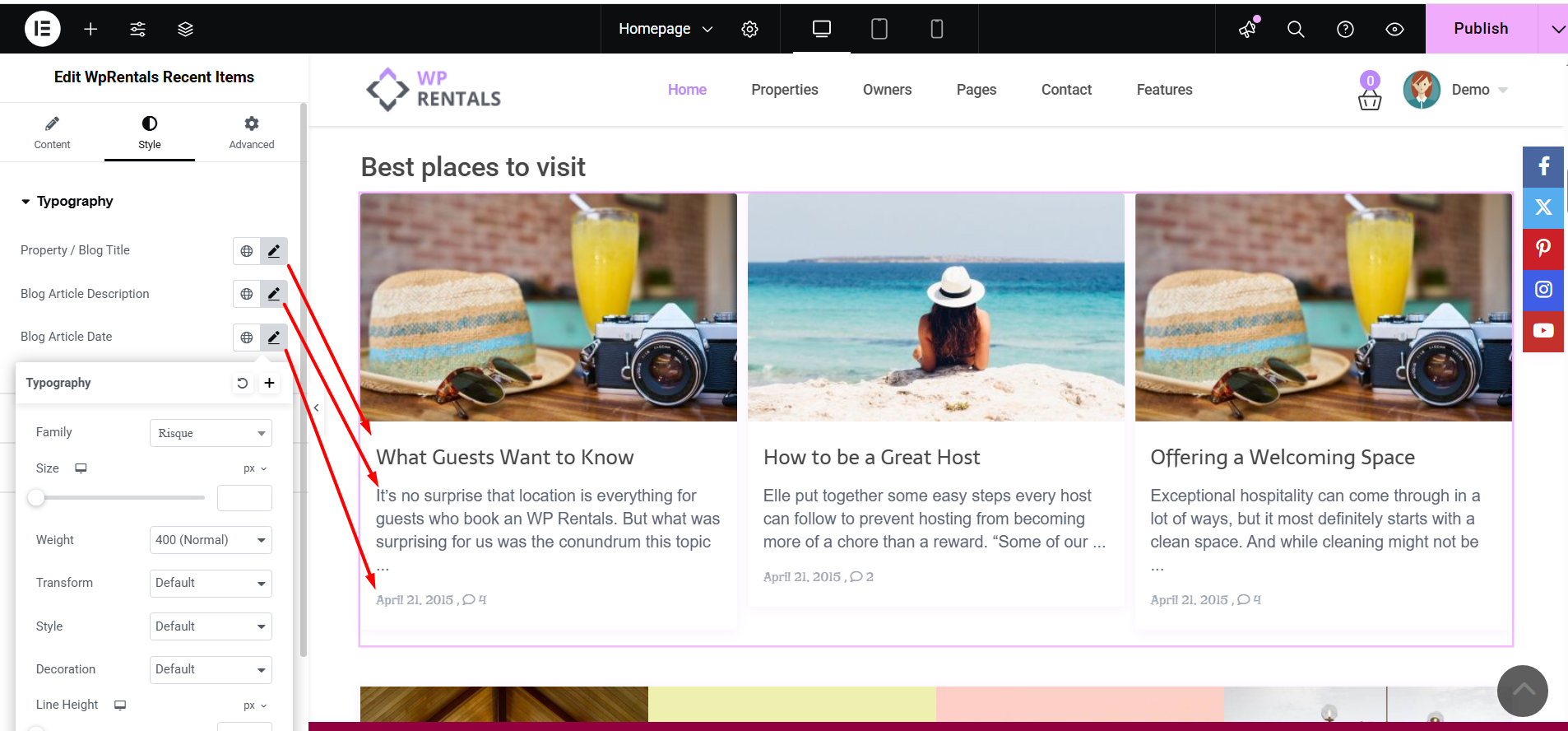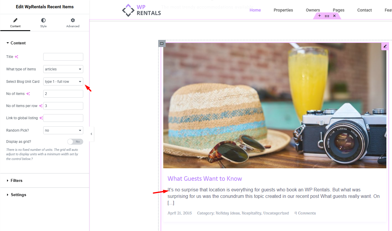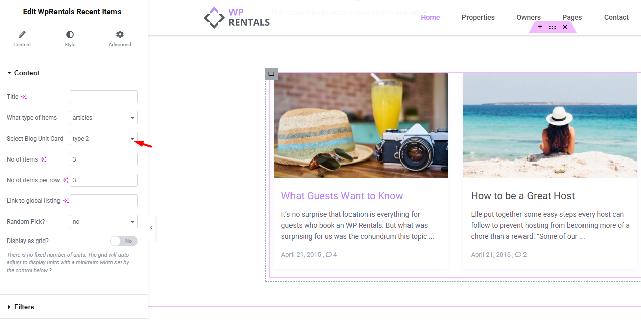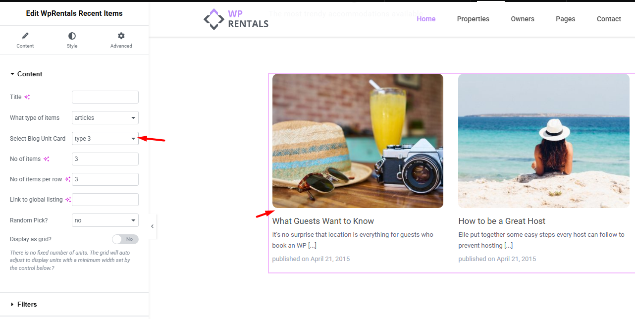 This widget allows you to list recent blog posts within the WpRentals theme, showcasing them in different layouts.