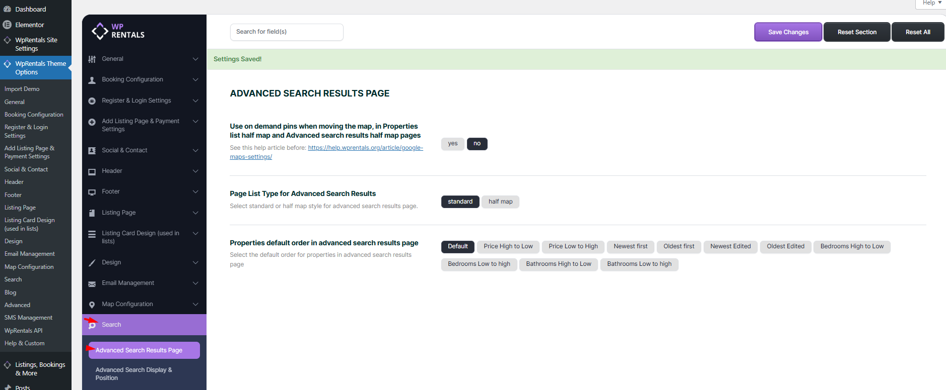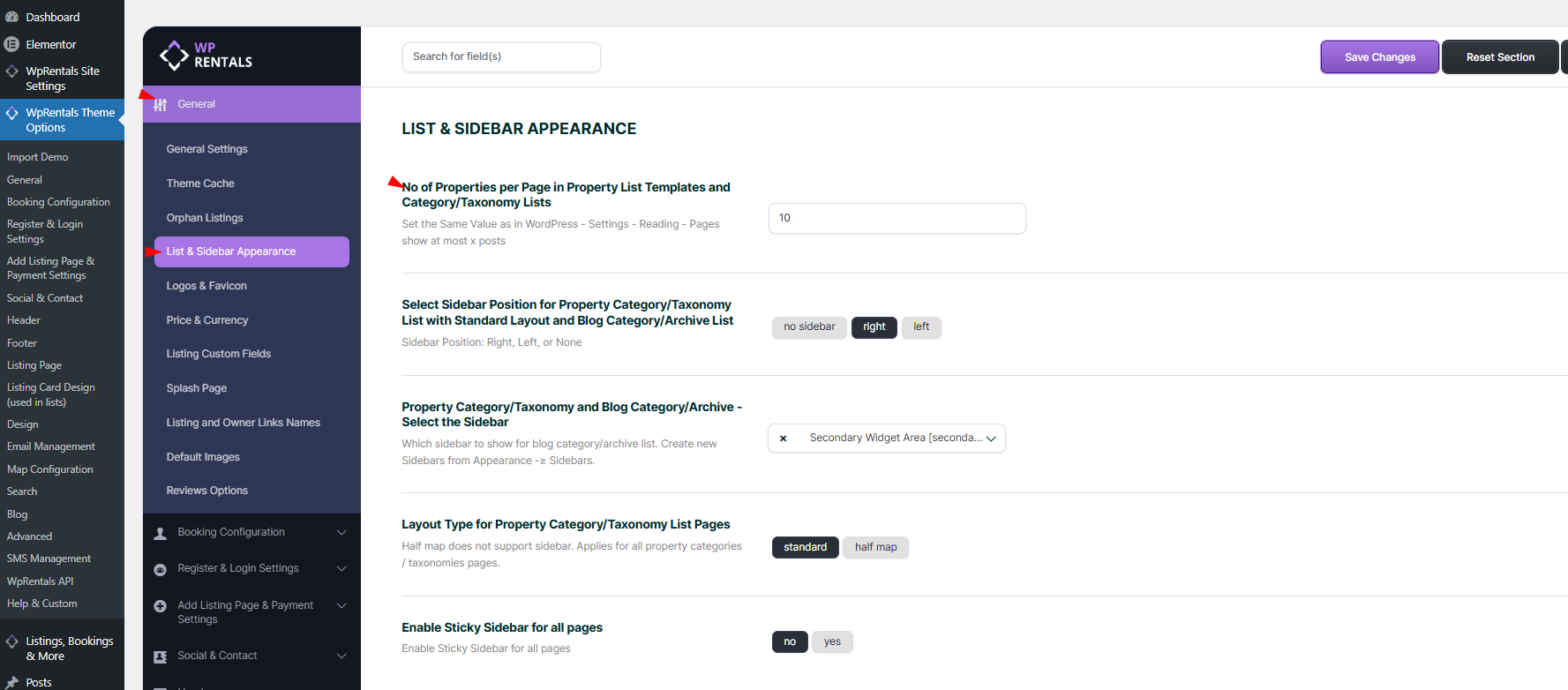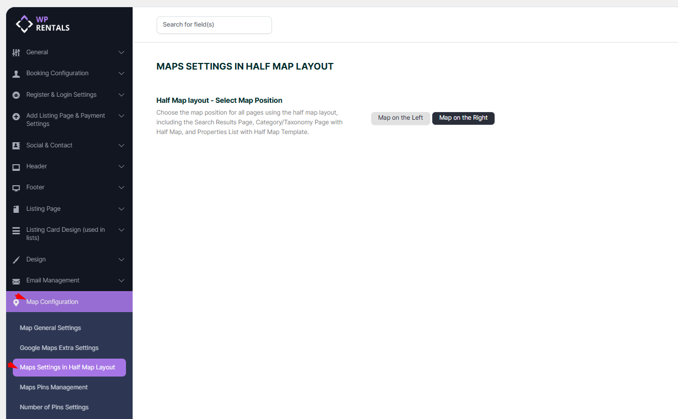 You can change the position of the map in the Half Map Layout. The map can be positioned on the left or right side. To switch the map’s position, go to Maps > Maps Settings in the Half Map Layout settings.