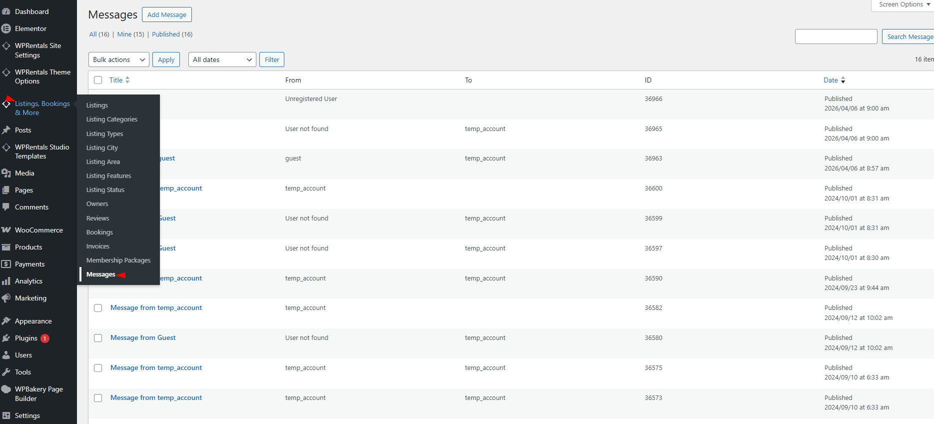 Administrators can also view all messages in the WordPress backend under the area for listings, bookings, and related management options.