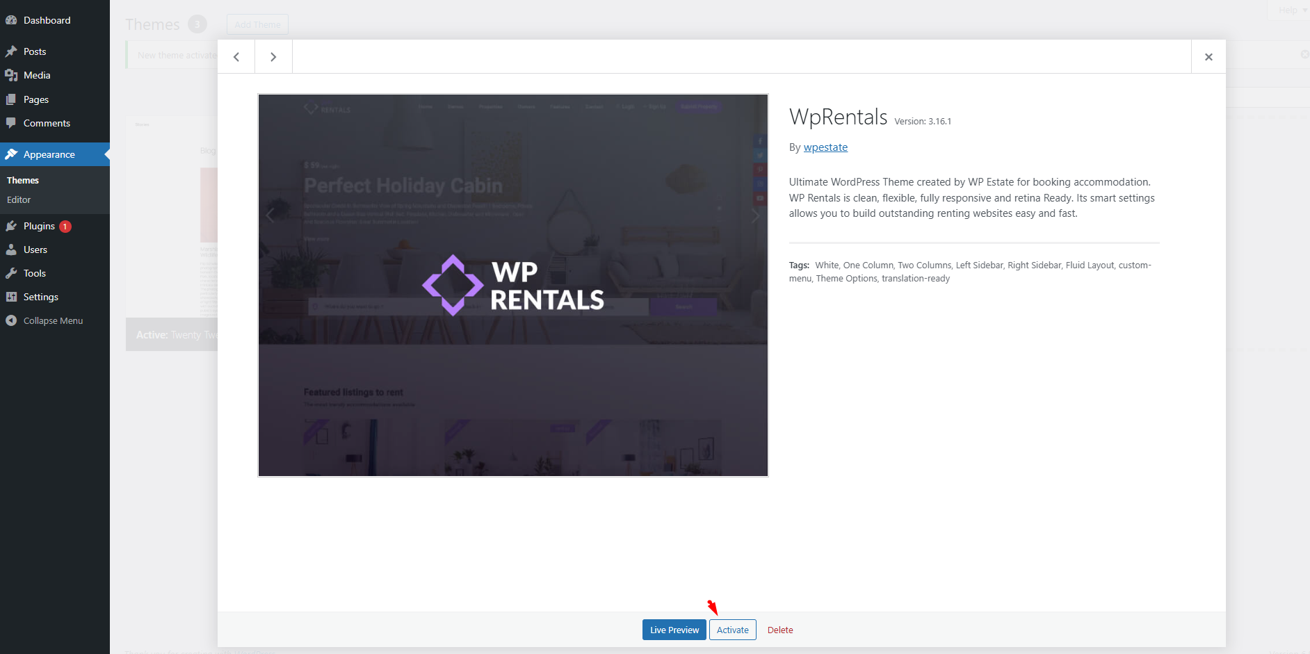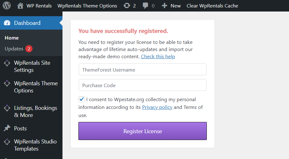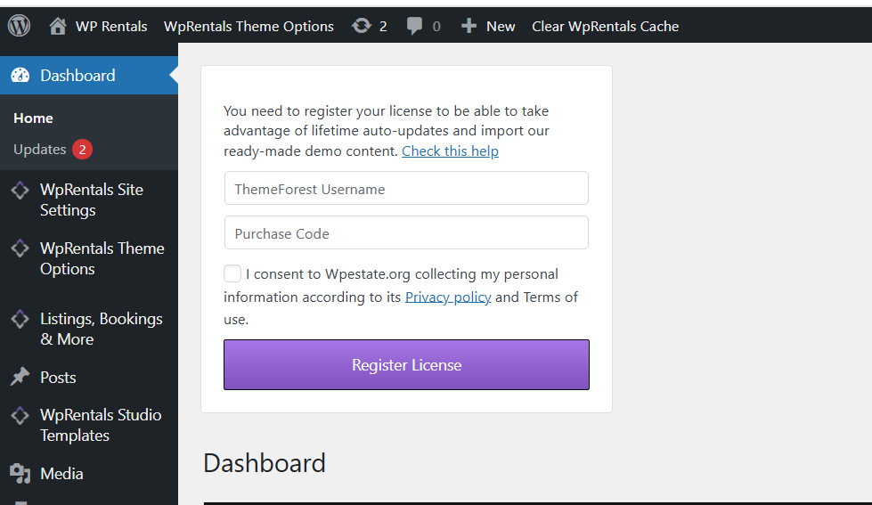 6. Activate the theme with your buyer license code – more here https://help.wprentals.org/article/where-is-my-purchase-code/
