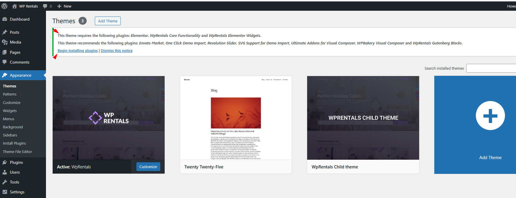 5. Install the mandatory plugins from Appearance > Install plugin. WpRentals Core Functionality is MANDATORY. Install this plugin before you activate the license!
