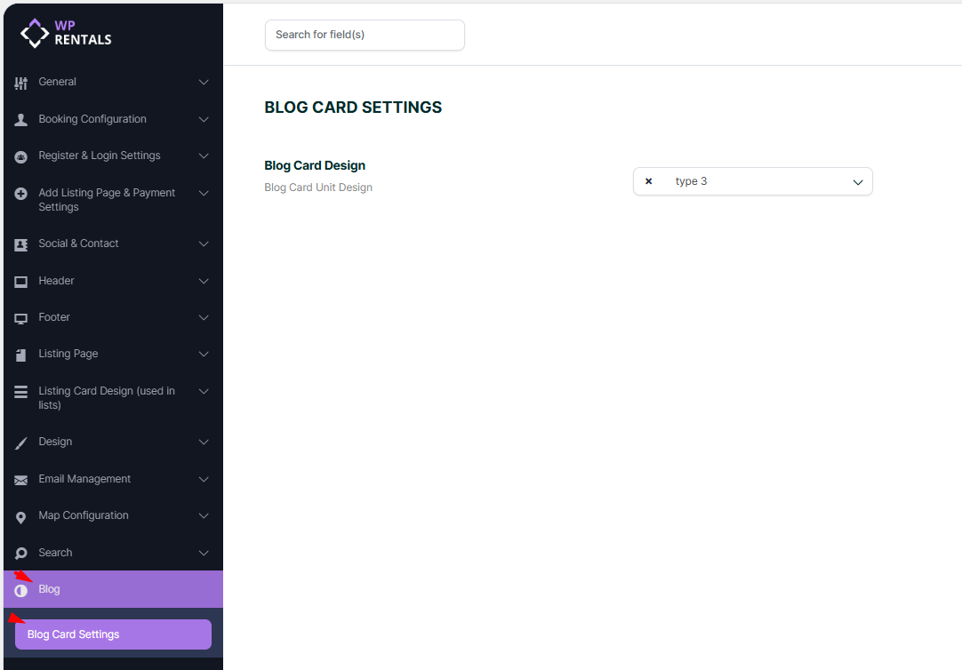 WordPress admin → WpRentals → Theme Options → Blog → Blog Card Settings